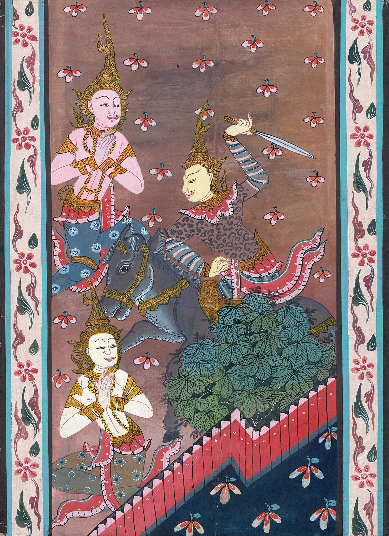 In der Tradition der chinesischen Gelehrtendarstellungen gehaltene Darstellung dreier Philosophen des Konfuzianismus und des Taoismus, hier in überaus feiner Deckfarbenmalerei auf Seide. Ein Gelehrter ist hinter einer Bank gelagert, auf der er sich mit gekreuzten Armen abstützt, ein weiterer hockt auf dem Boden, seine beiden Hände auf seinem Knie, den Blick bedeutsam in die Ferne gerichtet. Das dritte Bild zeigt einen Philosophen auf einem weichen, reich bestickten Kissenbett, seine roten Schuhe stehen davor, während ihm sein Adlatus eine Schrif ttafel reicht. – Teils etwas angestaubt, mit kleinen Knickrillen und vereinzelten leichten Fleckchen. Gebräunt und mit wenigen Oberflächenbereibungen (bei dritten Bild mit wenigen Abplatzungen der Farbe im Mantel des Dargestellten). Überaus dekorativ. Abbildung