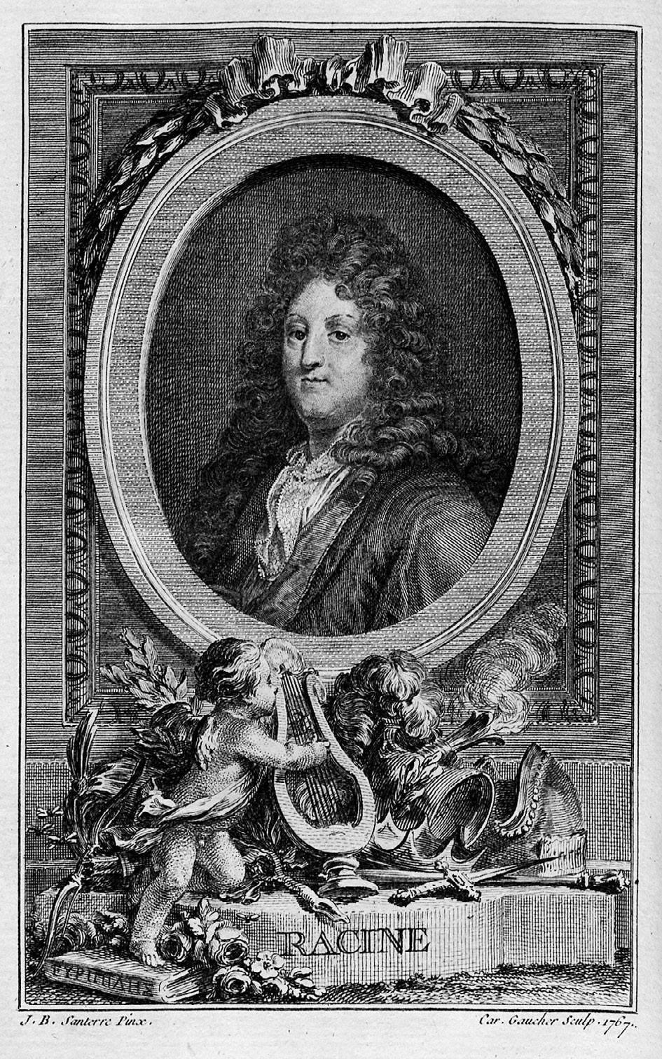 2085 Racine, Jean. Oeuvres. Avec des commentaires par M. Luneau de Boisjermain. 7 Bände. Mit 1 (statt 2) gestochenem Portraits und 12 Kupfertafeln nach Gravelot. 20 x 13 cm. Marmoriertes Kalbsleder d. Z. (etwas brüchig, Rücken mit kleinen Fehlstelle, bestoßen) mit reicher RVergoldung, je 2 goldgeprägten RSchildern, Dekkelfileten, Steh- und Innenkantefilete sowie Goldschnitt. Paris, Cellot, 1768.