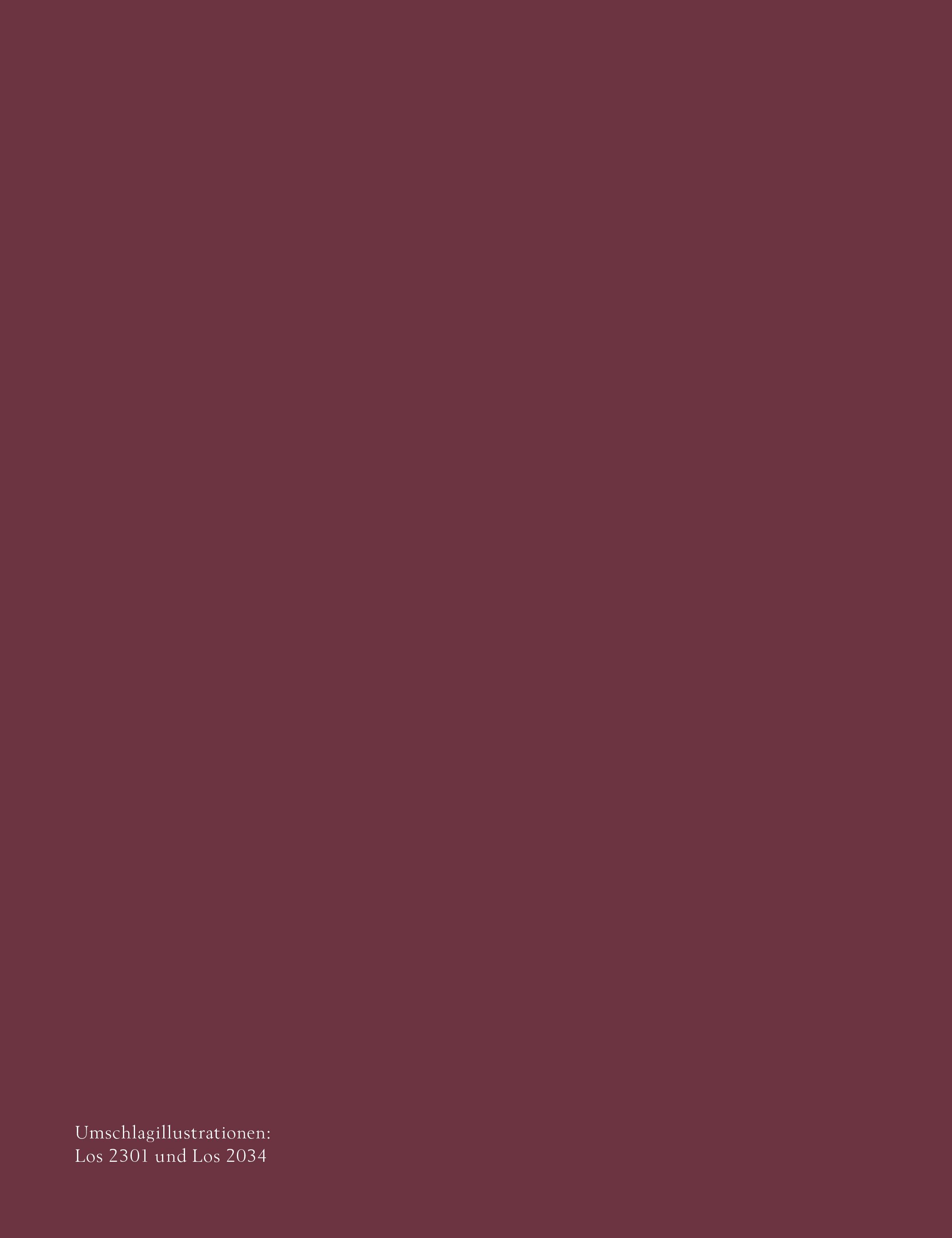 Für bundesdeutsche Kunsthändler und Antiquare, die zum Vor steuer abzug berechtigt sind, kann die Gesamt rech nung auf Wunsch, wie bisher nach der Regelbesteuerung ausgestellt werden. Von der Umsatzsteuer befreit sind Ausfuhrlieferungen in Drittländer (außerhalb der EU) und – bei Angabe ihrer USt. Identifikations Nr. bei Auftragserteilung als Nachweis der Berechtigung zum Bezug steuerfreier innergemeinschaftlicher Lieferungen –auch an Unternehmen in anderen EU Mitgliedsstaaten, unter der Voraussetzung, dass sie für gewerblichen Gebrauch einkaufen. Eine Korrektur nach Rechnungsstellung ist nicht möglich. Alle anderen Käufe aus EU Ländern unterliegen der Umsatzsteuer. Ausländischen Käufern außerhalb der Europäischen Union wird die Umsatzsteuer erstattet, wenn binnen 4 Wochen nach der Auktion der deutsche zollamtliche Ausfuhrnachweis und der zollamtliche Einfuhrnachweis des entsprechenden Importlandes erbracht werden. Bei Versand durch uns gilt der Ausfuhrnachweis als gegeben. Bei Online Live Geboten über externe Internetplatt formen erhöht sich das Aufgeld um die dort anfallende Transaktionsgebühr. Während oder unmittelbar nach der Auktion ausgestellte Rechnungen bedür fen einer besonderen Nachprüfung und eventueller Berichtigung; Irrtum vorbehalten. Katalog und Zusatzabbildungen dürfen nicht ohne Genehmigung verwendet werden. Reproduktionsrechte und digitale Dateien der Abbildungen können gegen Gebühr erworben werden.Gegebenenfalls noch bestehende Urheberrechte Dritter bleiben davon unberührt und müssen u.U. gesondert eingeholt werden.