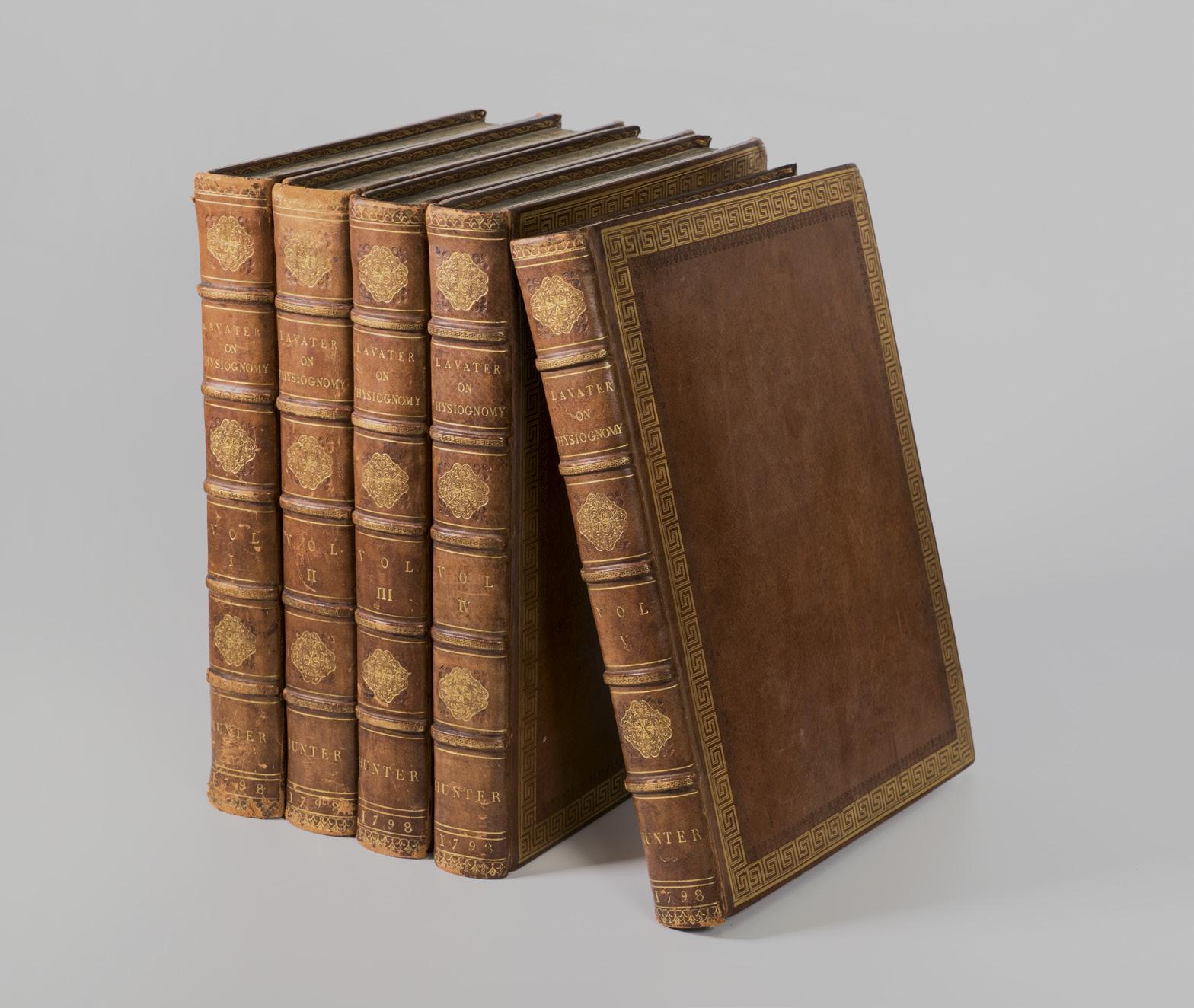 2099 Lavater, Johann Kaspar. Essays on physiognomy, designed to promote the knowledge and the love of mankind. Executed by Thomas Holloway. Translated from the French by Henry Hunter. 3 Teile in 5 Bänden. Mit 3 gestoch. Titelvignetten, 174 Kupfertafeln und ca. 360 Textkupfern, teils als Umriss-Radierung. 33,5 x 27,5 cm. Modernes Leder (berieben und bestoßen, Gelenke brüchig) mit Rücken-, Deckel-, Außen- sowie Innenkantenvergoldung. London, Murray, Hunter and Holloway, 1789-1798.