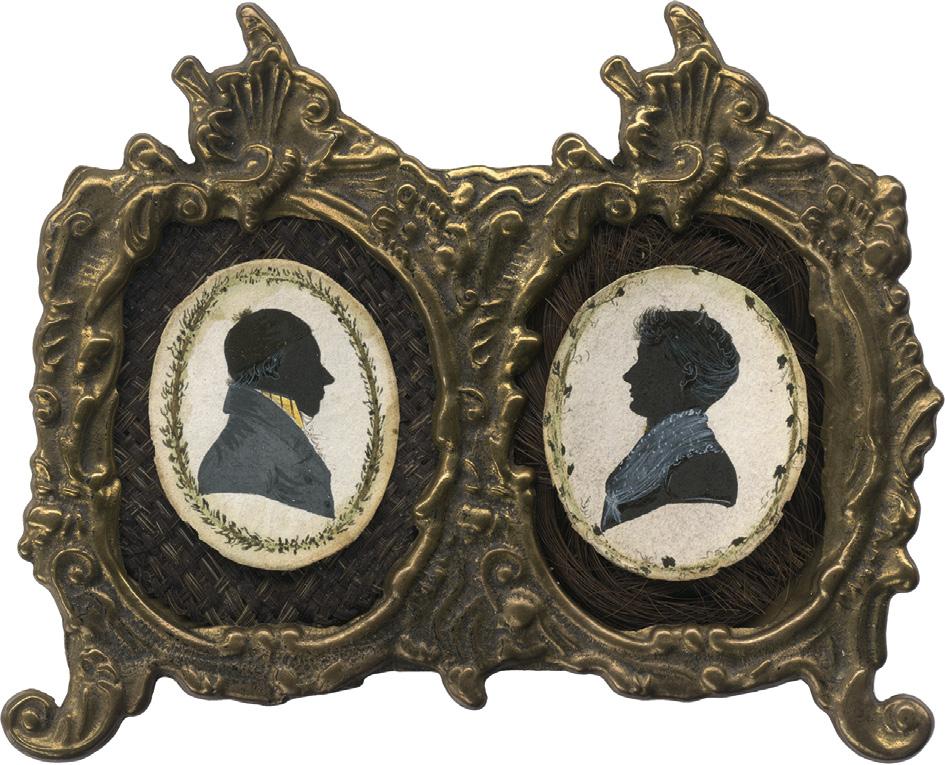 6305 um 1810. Miniatur Silhouetten-Paar, Mann und Frau, er mit Bommel-Kappe und gestreifter Weste, sie mit Kamm im hochgesteckten Haar und gepunktetem Brusttuch. Beide Tusche, teilweise hell gehöht, auf Pergament. Er 3,2 x 2,5 cm (oval), sie 3,2 x 2,7 cm (oval). Beide auf Menschenhaar aufgezogen, in querrechteckigem gemeinsamen Rokoko-Stilrahmen aus Messing.