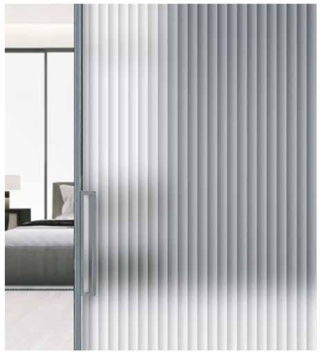 Description and performance: the printed side is chemically satin-finished, opaque, very smooth, velvety to the touch. Effective visual obscuration and optimal light diffusion are the key properties. Thanks to its low porosity, it ensures greater resistance to fingerprints and easier cleaning than traditional sand-blasted glass.