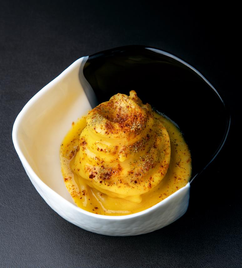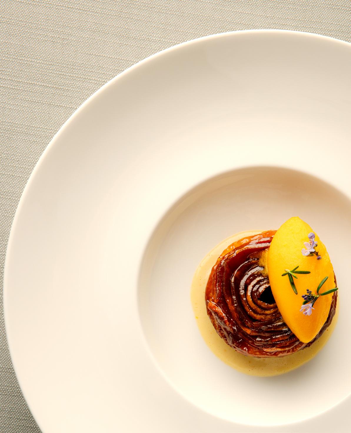 Plating: Place 35 g of the butter and sugar mixture at the base of four 6 cm diameter silicone moulds. On top of the mixture, place a ‘rose’ of caramelised pumpkin and cover with a disc of puff pastry 8 cm in diameter, folding the sides over to enclose the filling. Bake at 185°C in a slightly ventilated oven for 30 minutes. As soon as they come out of the oven, turn the tarte tatin out onto a baking tray lined with parchment paper. Pour the warmed crème anglaise into the centre of a deep plate. Place the tarte tatin on top and complete with a quenelle of sorbet and a few rosemary flowers.