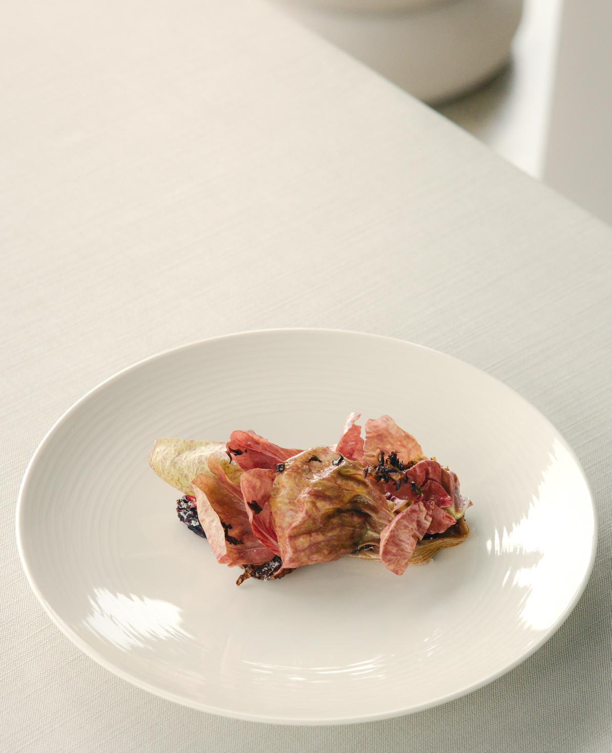 Radicchio: Remove the outer leaves but don’t discard them, cut the radicchio in half lengthwise and place in a sous-vide bag with two knobs of butter, 5 g of rose petals, salt and 2 tablespoons of shiro tamari. Cook in a Roner at 84°C for 40 minutes.
