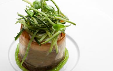 For the sauce: thinly slice the shallot and leave to wilt in a casserole dish with a knob of butter. Add the citron juice and reduce by 2/3. Add half the cream and the celeriac stock (made by roasting 2 celeriac pieces in the oven, then leaving them to infuse, covered with water, over a very low heat for 3 hours). Leave to simmer for 10 minutes. When cooked, add the rest of the cream, the peppercorns and season with salt, then leave to infuse covered with cling film for 15 minutes: filter and weigh. Thicken with xanthan gum (0.2% of the total weight).