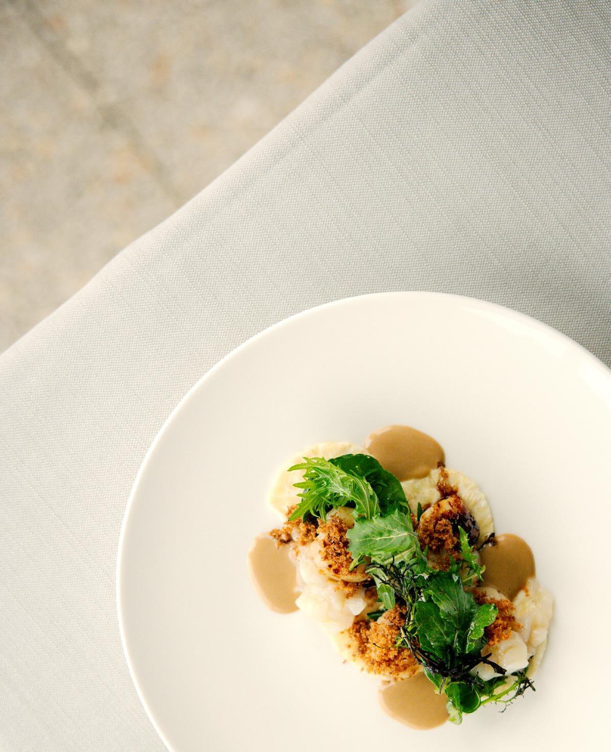 Herb butter: in a small saucepan, make the browned butter, removing the light frothy part that will form on the surface. Add the citron juice and the chopped herbs. Scallops: open the shells and remove the meat, which should be cleaned of membranes and rinsed. Marinate 12 scallops with salt and sugar (as for the celeriac) and after half an hour rinse them. Heat an iron frying pan and roast the scallops: 30 seconds per side, then deglaze with cedar juice. Cut the remaining scallops into tartare and season with salt, oil and cedar zest.
