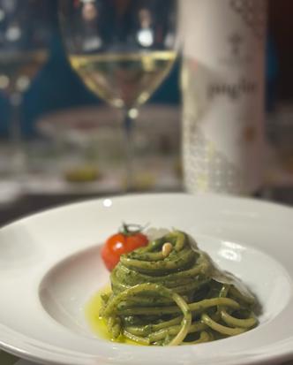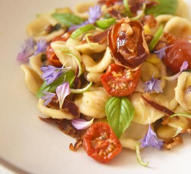>Tube pasta with creamy helichrysum, miso and walnut sauce