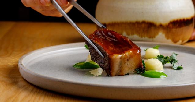 Rhubarb cream and glaze: Place the rhubarb in a vacuum bag with two knobs of butter, the bay leaf, a few grains of Madagascar pepper and salt. Cook in the roner at 75 degrees for 40 minutes. Once cooked, keep the liquid for the glaze and blend the solid parts instead, whipping them with a little olive oil to obtain a smooth cream.