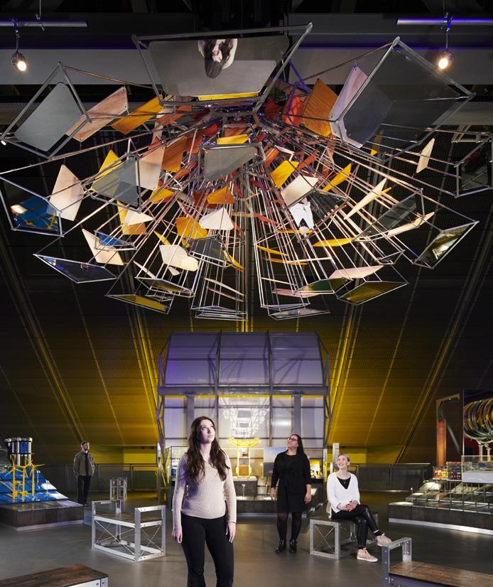 A At the centre of the gallery is Only Breath, a kinetic sculpture that moves and blooms, stretching to around 5m in diameter when unfurled. Made from repurposed mirrors, recyclable stainless steel and windblown wood, it signifies the power of nature to inspire technological change.