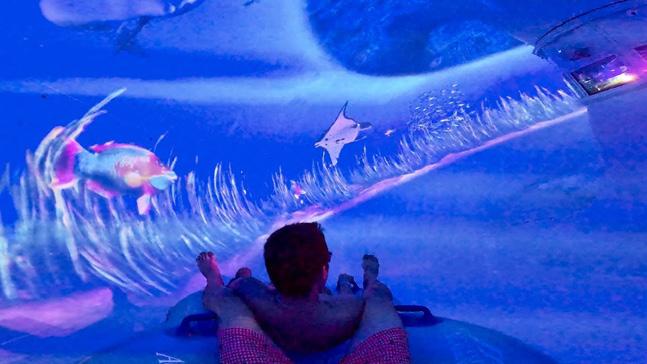 Last month, the waterpark inaugurated the Tassie’s Underwater Twist waterslide, a revamp of Tassie Twisters, a pair of WhiteWater West’s Super Bowls dating back to 2008. The 2-seater raft ride launches from a tower and moves down into 2 big bowls, and that’s exactly where the experience is now different. The bowls have been enclosed, and there are projections of sea life on the interior ceilings of the structures. So all while twisting, turning and swirling through