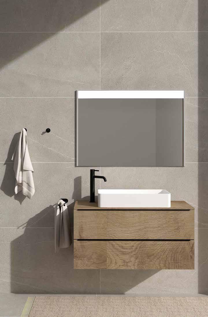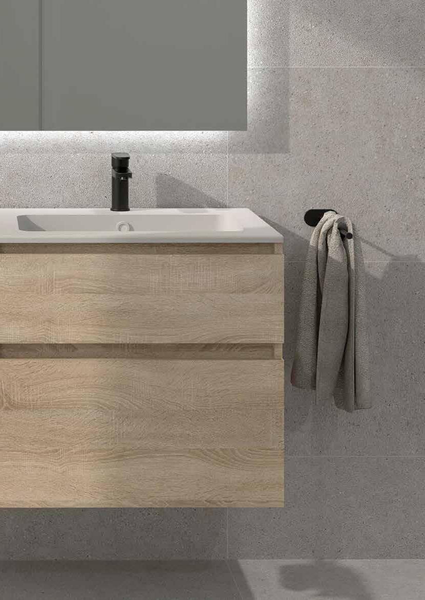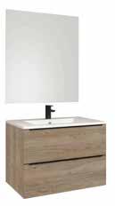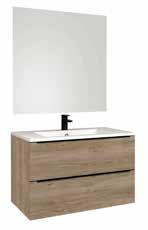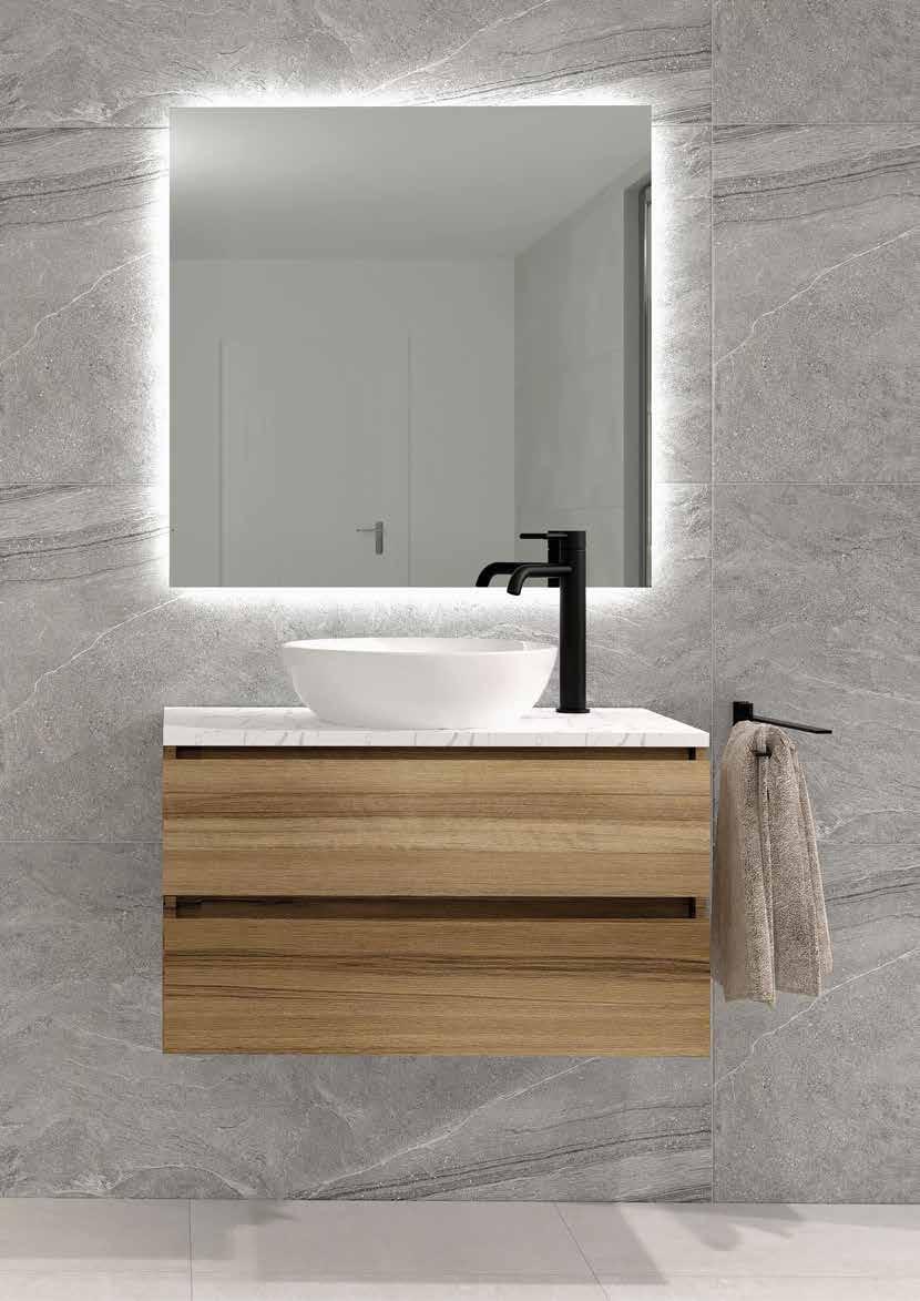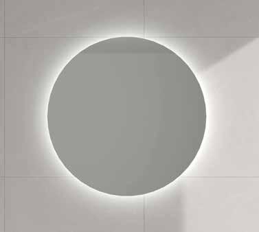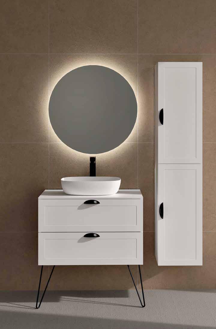 Combinação composta por um móvel DONNA de 80 cm na cor mare. Coluna de 124 cm na cor mare Lavatório branco mate BIANCO V de 80 x 46 cm. Espelho retroiluminado MOONLIGHT de Ø 75 cm.