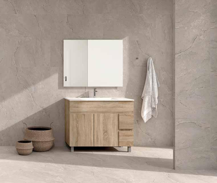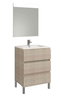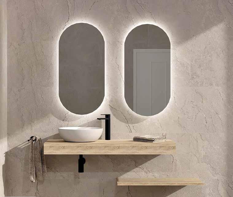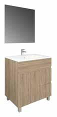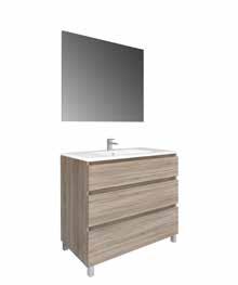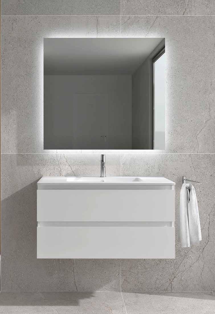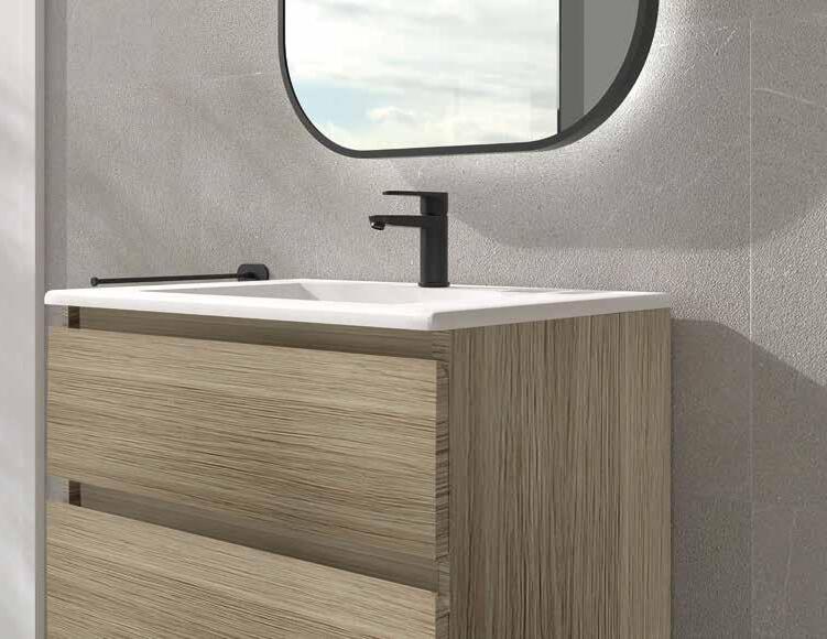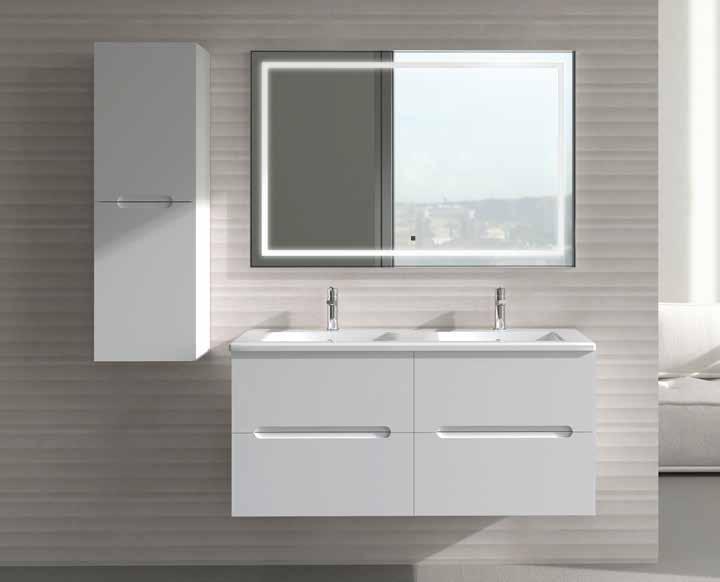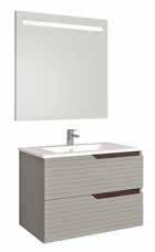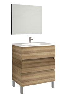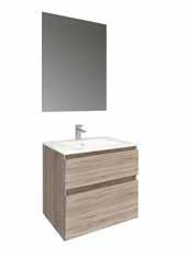 Combinação composta por um móvel DONNA de 80 cm na cor mare. Coluna de 124 cm na cor mare Lavatório branco mate BIANCO V de 80 x 46 cm. Espelho retroiluminado MOONLIGHT de Ø 75 cm.