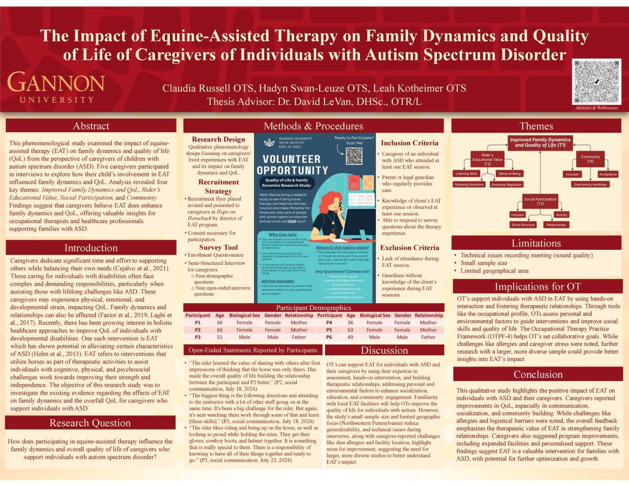 Abstract: This phenomenological study examined the impact of equine-assisted therapy (EAT) on family dynamics and quality of life (QoL) from the perspective of caregivers of children with autism spectrum disorder (ASD). Five caregivers participated in interviews to explore how their child’s involvement in EAT influenced family dynamics and QoL Analysis revealed four key themes: Improved Family Dynamics and QoL, Rider’s Educational Value, Social Participation, and Community Findings suggest that caregivers believe EAT does enhance family dynamics and QoL, offering valuable insights for occupational therapists and healthcare professionals supporting families with ASD.