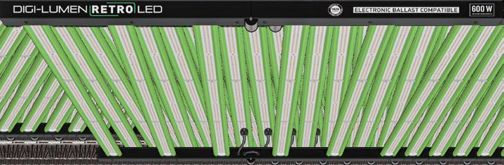 The new Digi-Lumen LED Array is the first to operate directly from a 600 W, 240 V electronic ballast.The Digi-Lumen LED Array features 720 Watts of Optimum diodes to ensure plenty of LED power when operated on the boost setting of your Electronic Ballast. Increase light output by 60% over an HPS lamp with up to 1820 µmol/s of output at 690 Watts. Unplug your HPS, plug in an LED, and immediately decrease radiant heat. The six-bar LED delivers light more evenly over a 1.5 m² area than an HPS lamp.