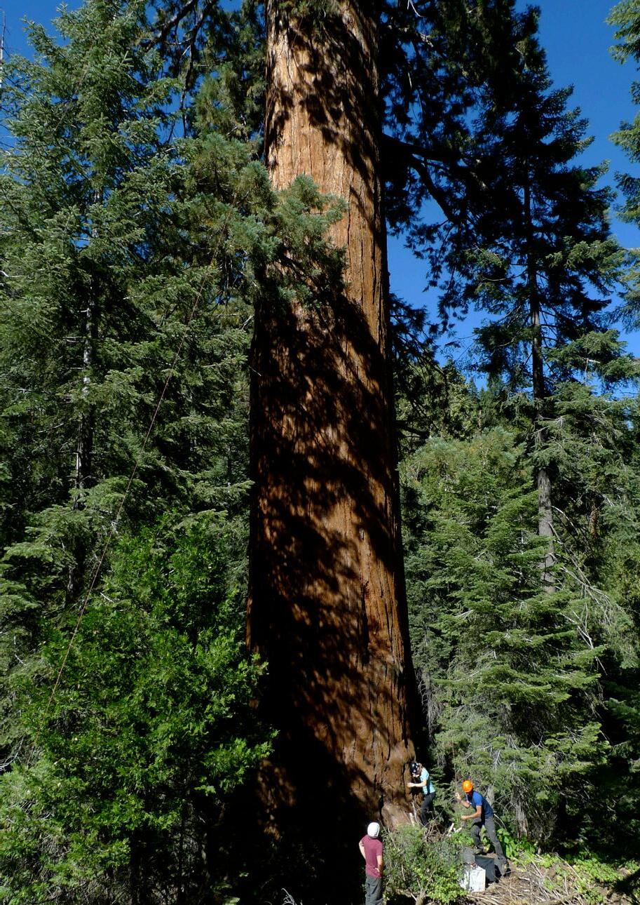 At just over 200 feet, I finally reached a place where I could get to a live leaf. I was exhausted by the physical strain and pushing my adrenaline to the max. I could barely move my hands and arms. I wrestled the electrode free from my belt, and the head climber attached it to the tree.