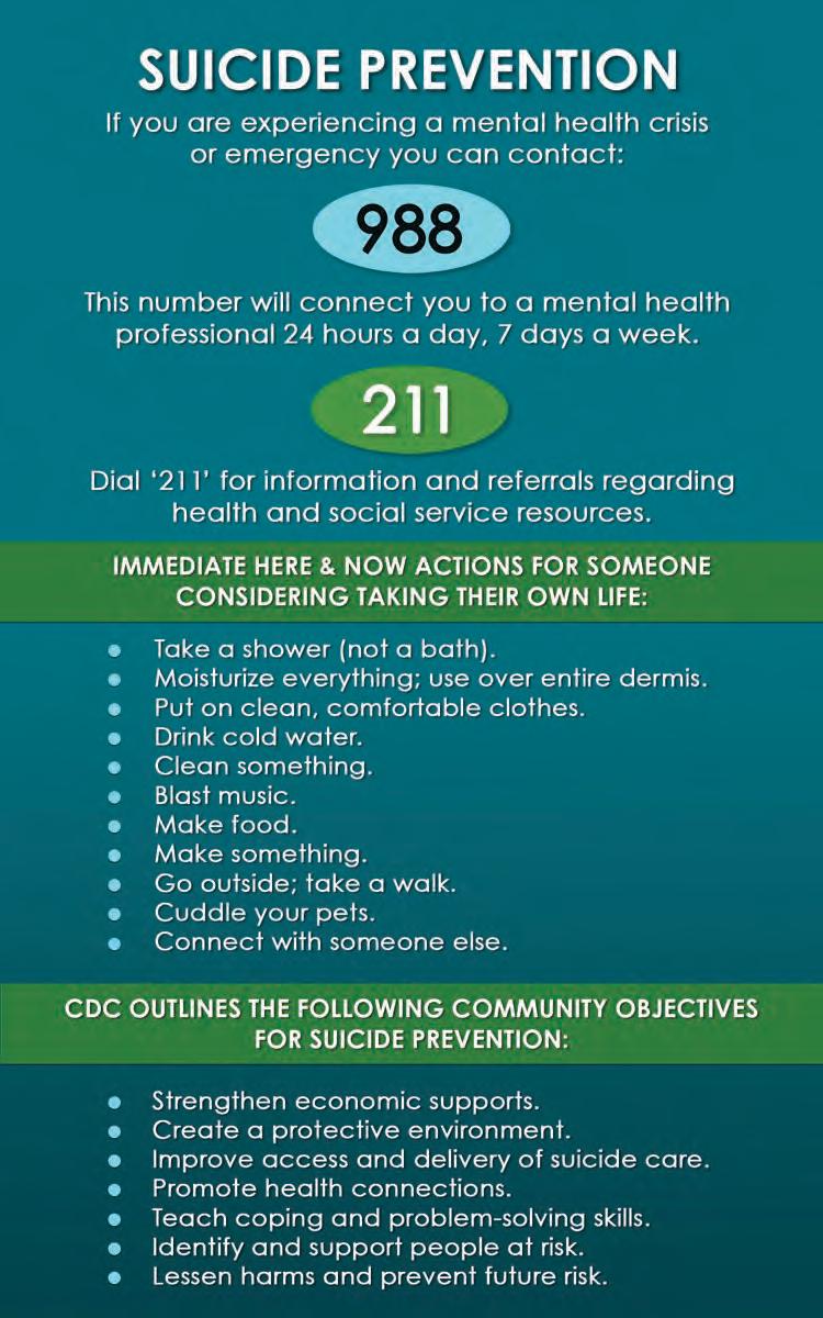 We have partnered with Renew Counseling, along with groups like the Samaritans mentioned in the play. They are always available to all communities, 24/7, seven days a week. You may read more about their work here: https://988lifeline.org/