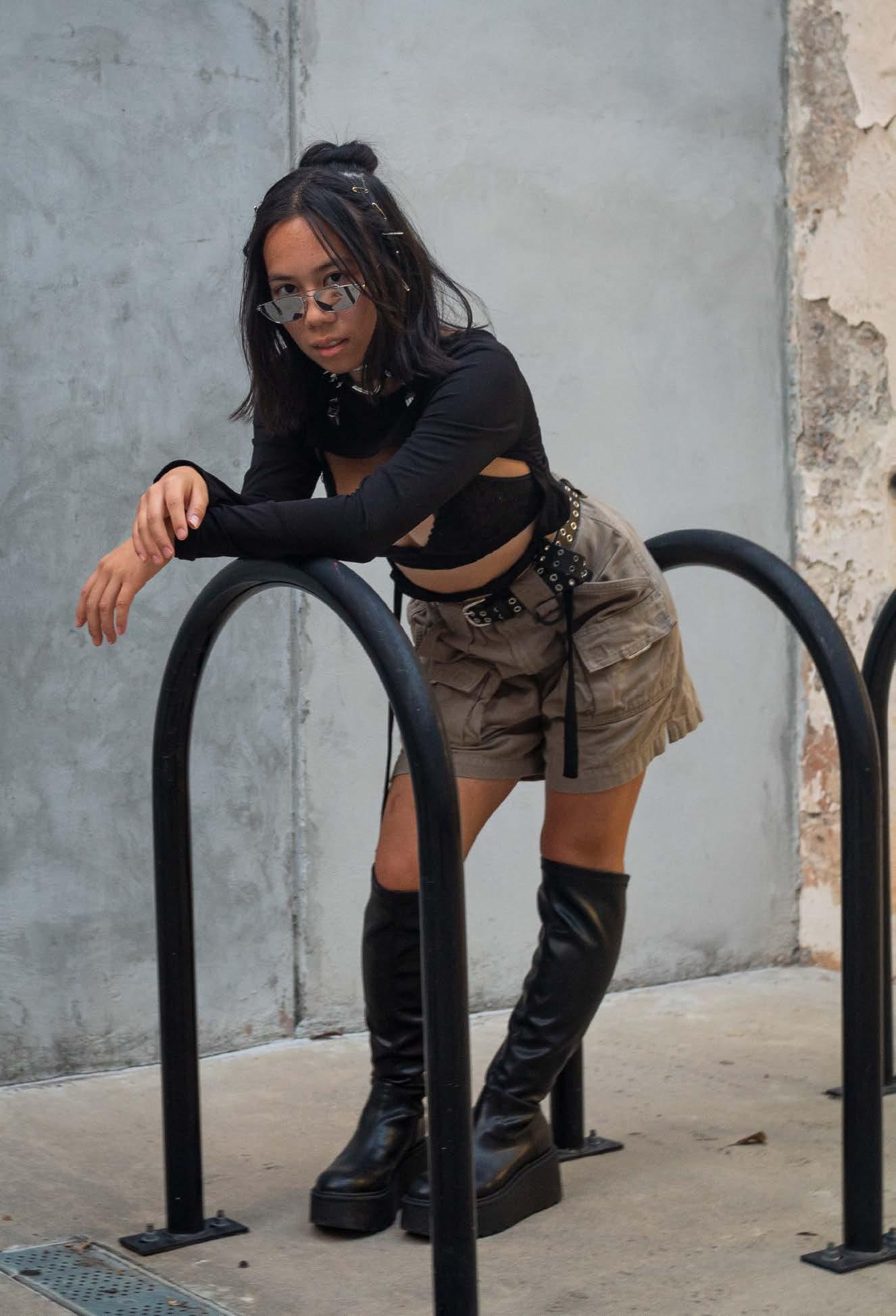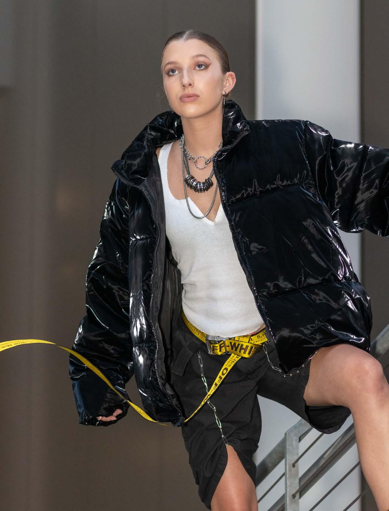 This industrial utilitarian inspired streetwear aesthetic utilizes neutrals, black and white, and metallic accents to showcase urban fashion. This style focuses on accessorizing with industrial gear, such as combat boots and utility belts, to emphasize the aesthetic of useful fashion. GARNET & BLACK | 62