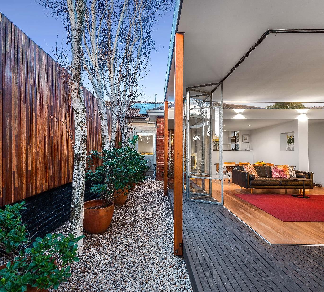 height glass windows & doors, this inviting space is highlighted by a privately enclosed internal atrium & extends further to a north-facing alfresco terrace. A dedicated study with custom joinery, fold-out desk & retro bar adds to the appeal. While a functional kitchen with plenty of storage leads to a separate laundry with access to a rear garden. Away from the living zone, the hallway delivers a main bedroom as well as two additional bedrooms all enhanced by original parquetry floors & bespoke built-in cabinetry. The bedrooms share a central bathroom & separate toilet. Other features include a double carport & ducted heating.