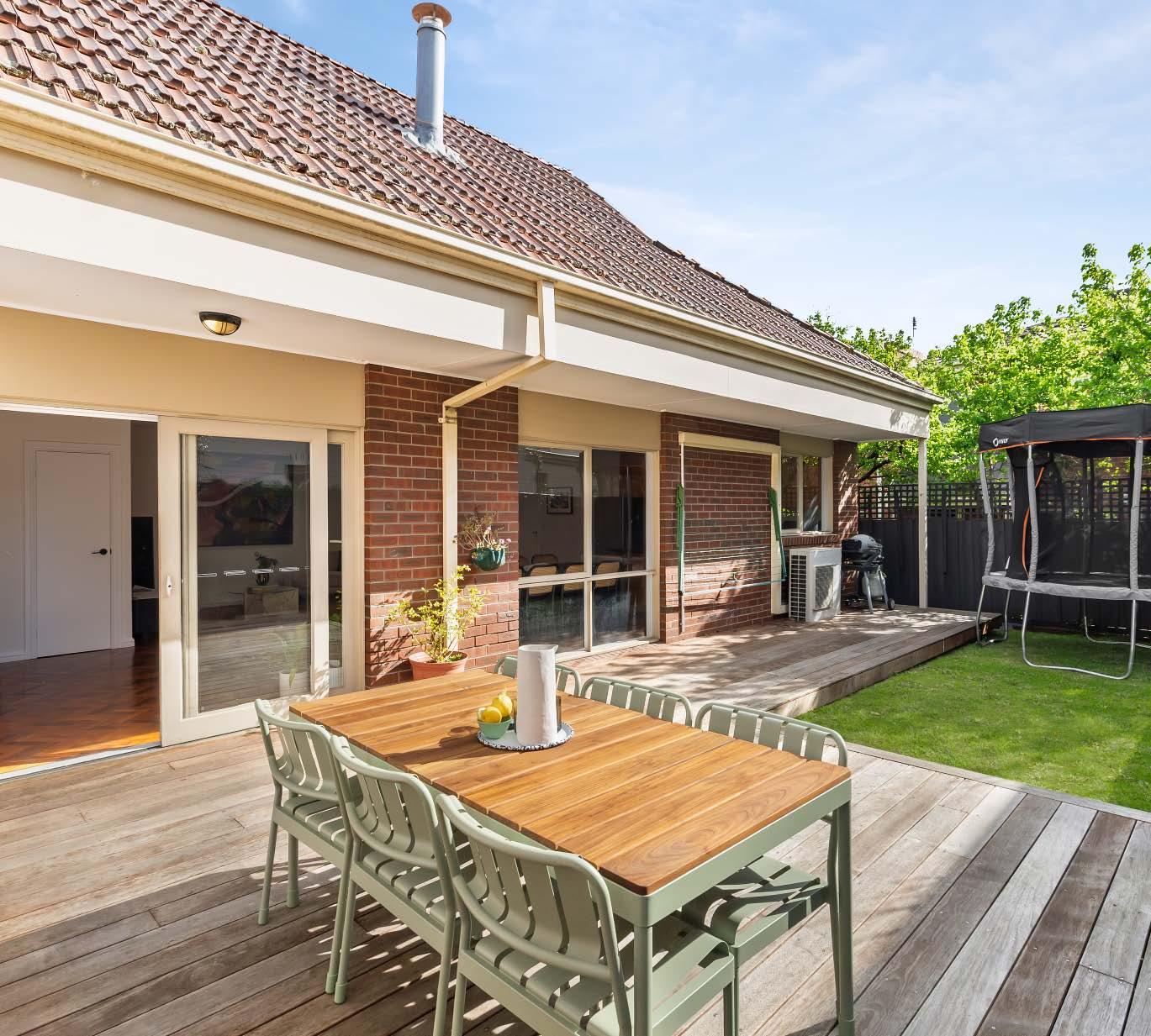 bathroom with bath & shower. The hallway culminates in an expansive light saturated living & dining zone with built-in cabinetry. An updated well appointed kitchen complete with stainless steel appliances, breakfast bar & plenty of storage, further adds to the appeal. Sliding doors extend the living outdoors to a covered deck overlooking a sun-drenched north facing garden framed by established greenery – the perfect space for family enjoyment or relaxed alfresco entertaining. Other features include a fitted laundry, split system heating/cooling, plantation shutters, rear storage shed & off street parking for one car.