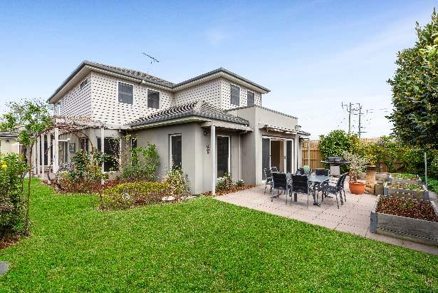 Fronting a boutique block of just five, this doublestorey three-bedroom town-residence boasts immaculate street appeal & stylish contemporary updates both indoors & out. Introduced by a beautifully manicured front garden, a codesecured front door reveals a light-filled family living area lined with two sets of bay windows to one side & a sliding glass door to the other, offering both access to the home’s decked alfresco as well as a conduit for streams of northern sunlight. An adjacent kitchen & meals with sleek stone benchtops is equipped with an oven, gas cooktop & dishwasher. A sliding glass