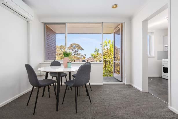 Stylish top-to-bottom updates, a sunlit aspect & serene leafy outlooks underpin this singlebedroom sanctuary in the heart of seaside St Kilda. Enjoying a prime top-floor position, the immaculate interior has been meticulously renovated by its current owner to include solidoak flooring, imported Spanish tiles & brand-new wardrobes. Filling the living & dining space with streams of natural light, large western windows frame a leafy treetop outlook, while capturing a glimpse of our city’s striking skyline. A renovated composite-stone kitchen includes a stainlesssteel oven, induction cooktop & both an integrated
