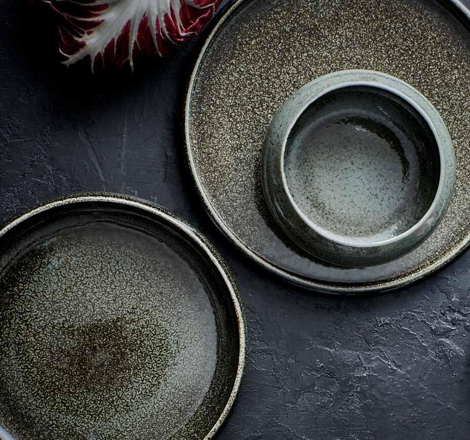 Each piece is slightly different and is characterized by different soft shades of grey and olive green. The silky matte finish on the in- and outside provide a unique table experience.