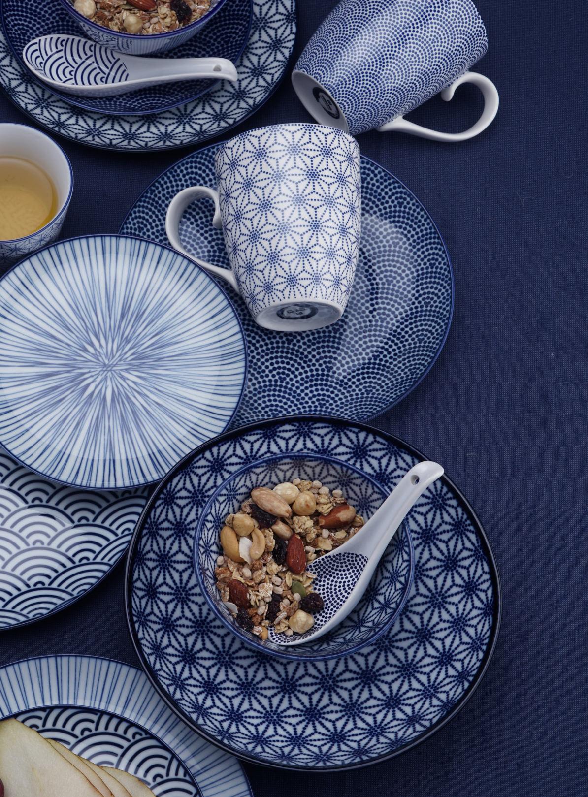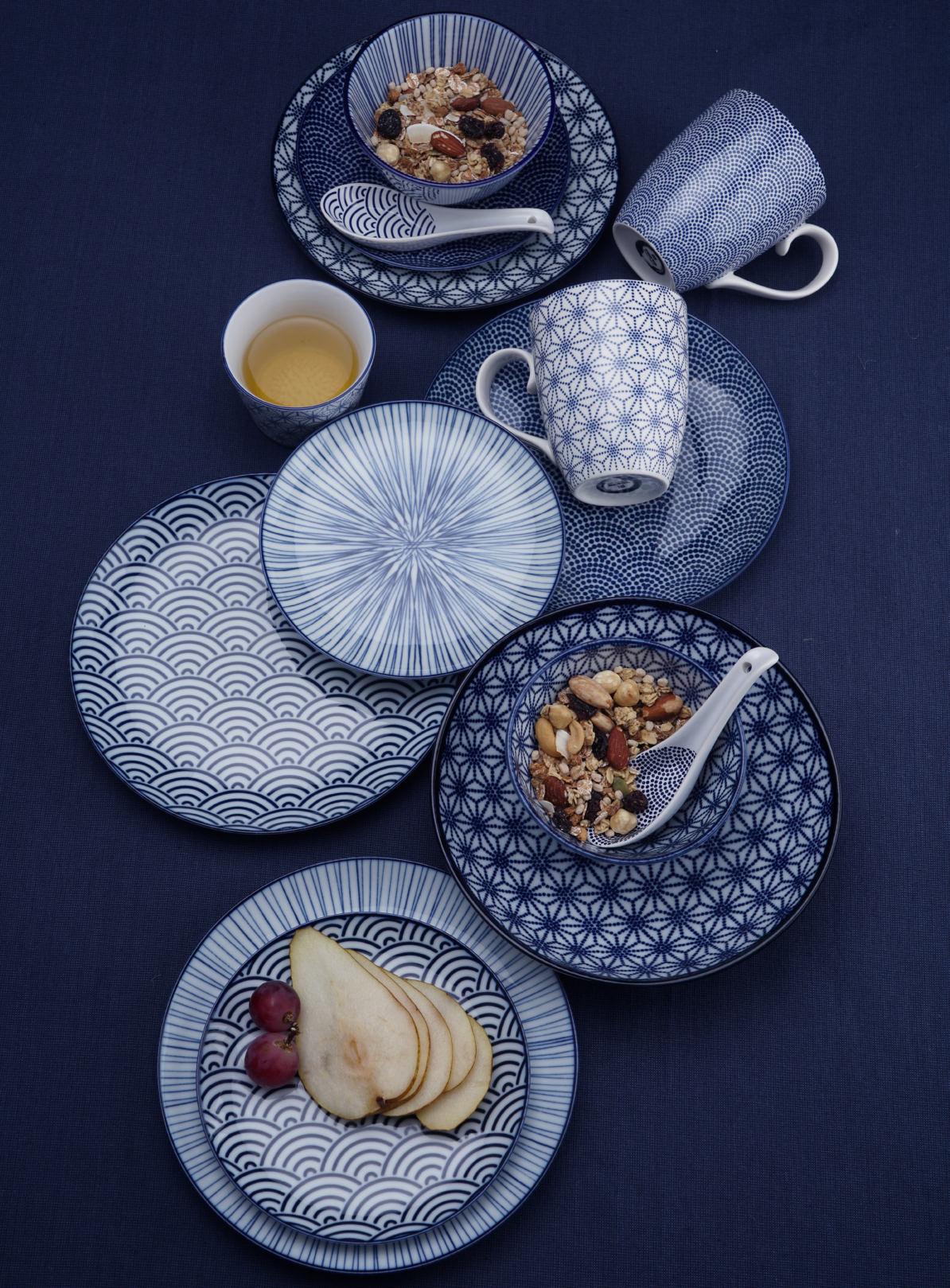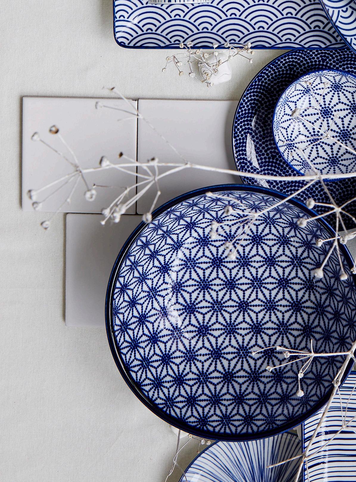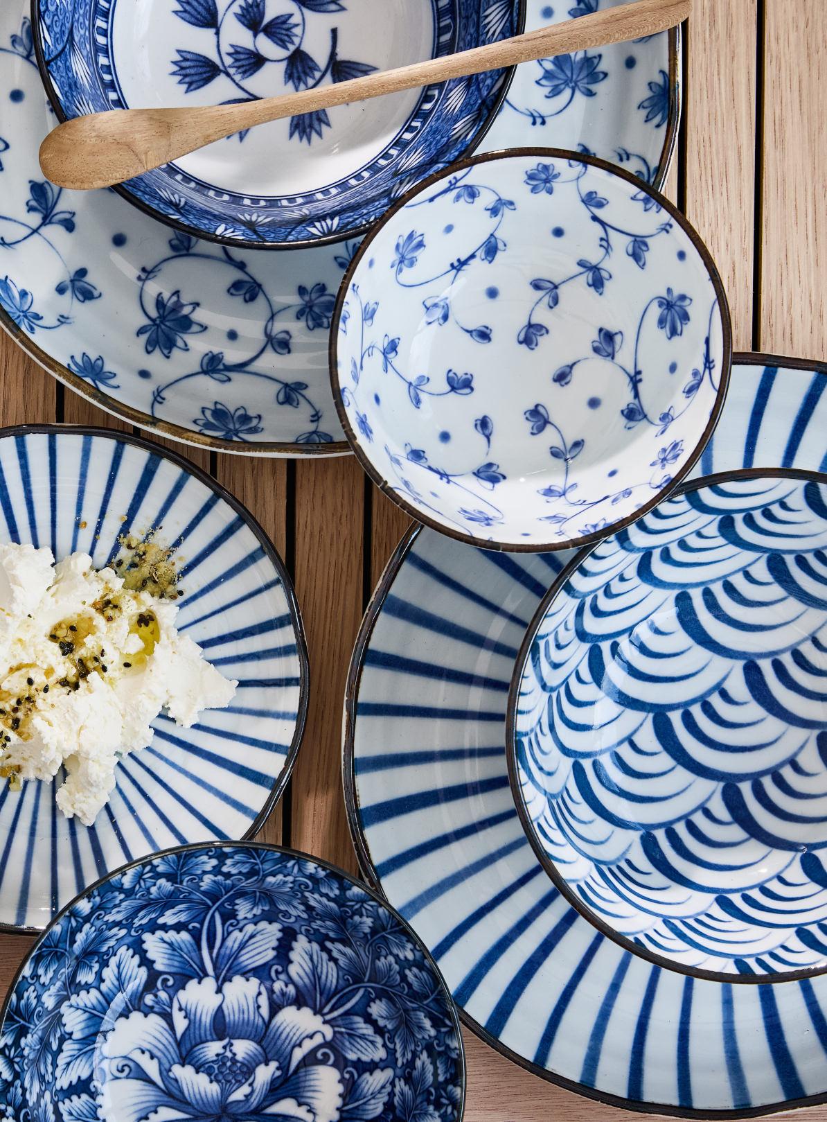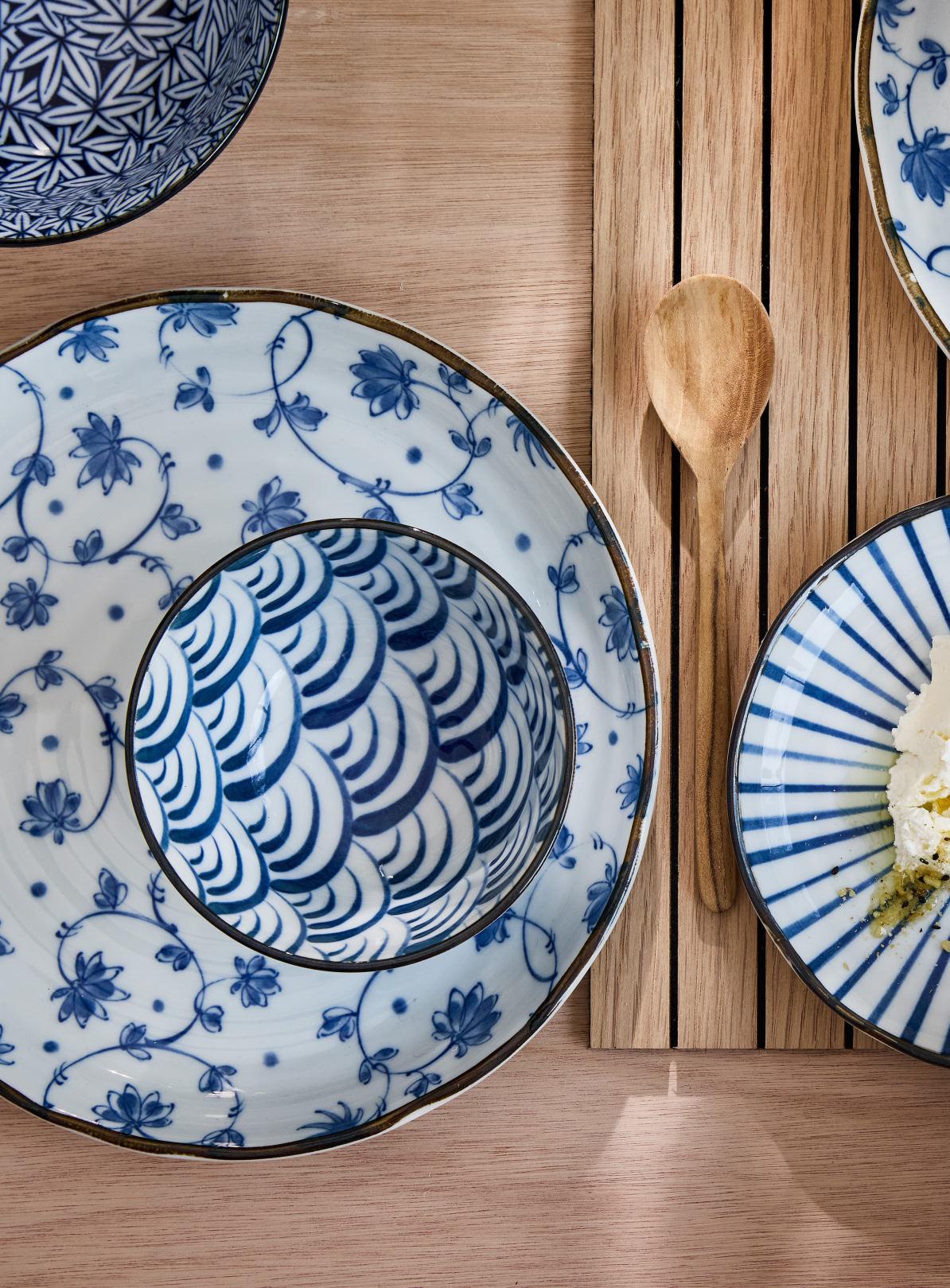 This succesful collection is created using a technique called "sometsuke." This technique involves painting cobalt blue pigment onto the white porcelain surface before glazing and firing it. The products often feature intricate floral motifs, such as cherry blossoms, peonies or chrysanthemums, The combination of blue and white is highly prized in Japanese culture and is often associated with elegance, simplicity, and a sense of tranquility.