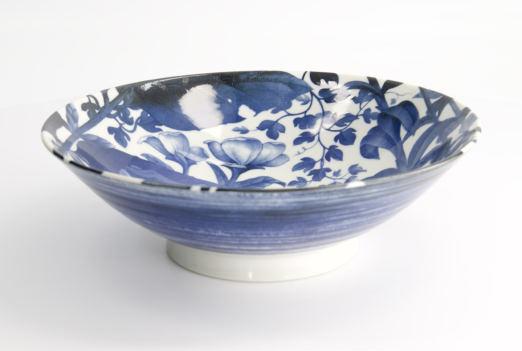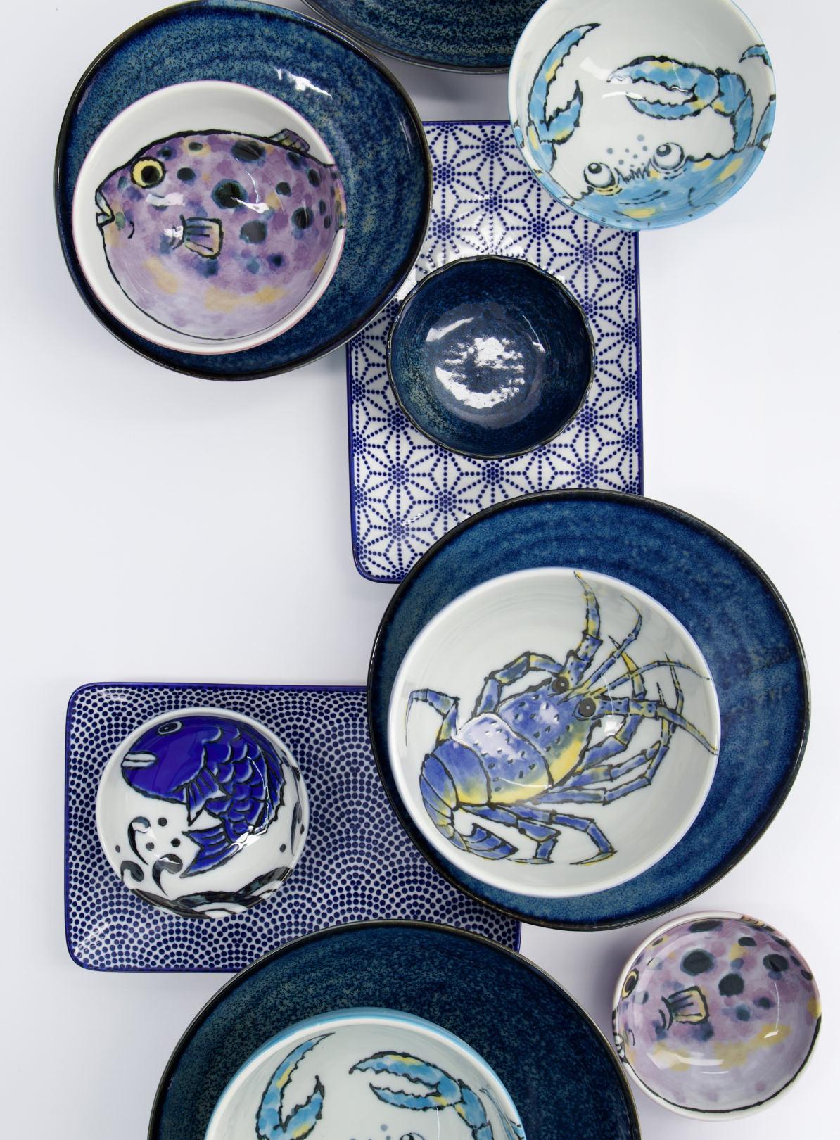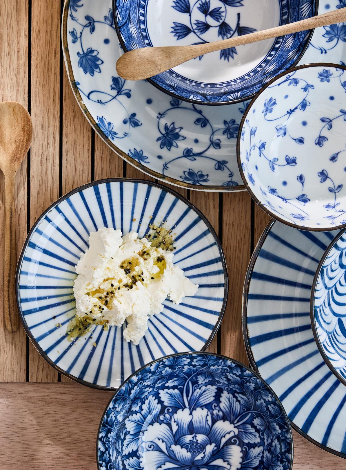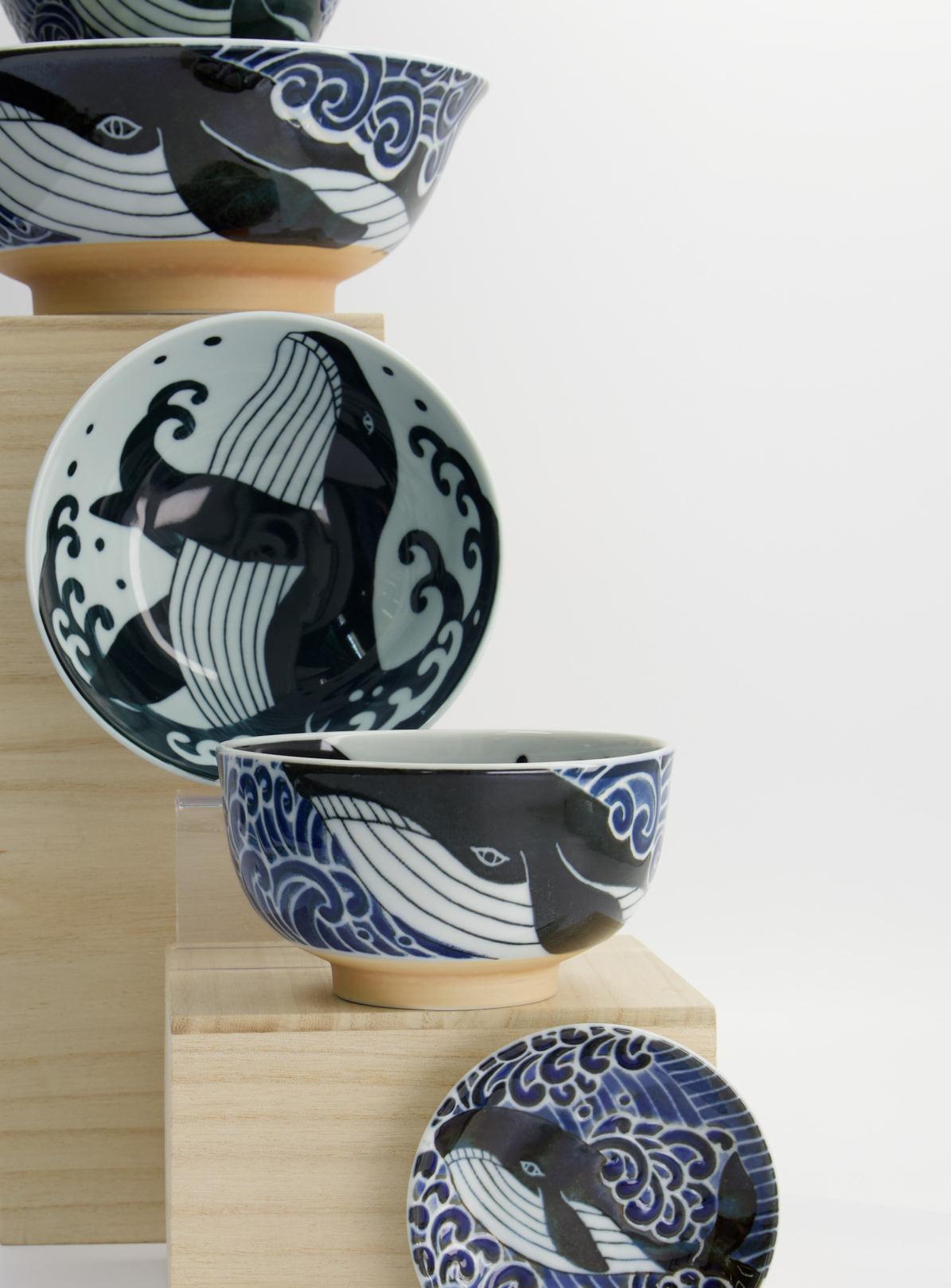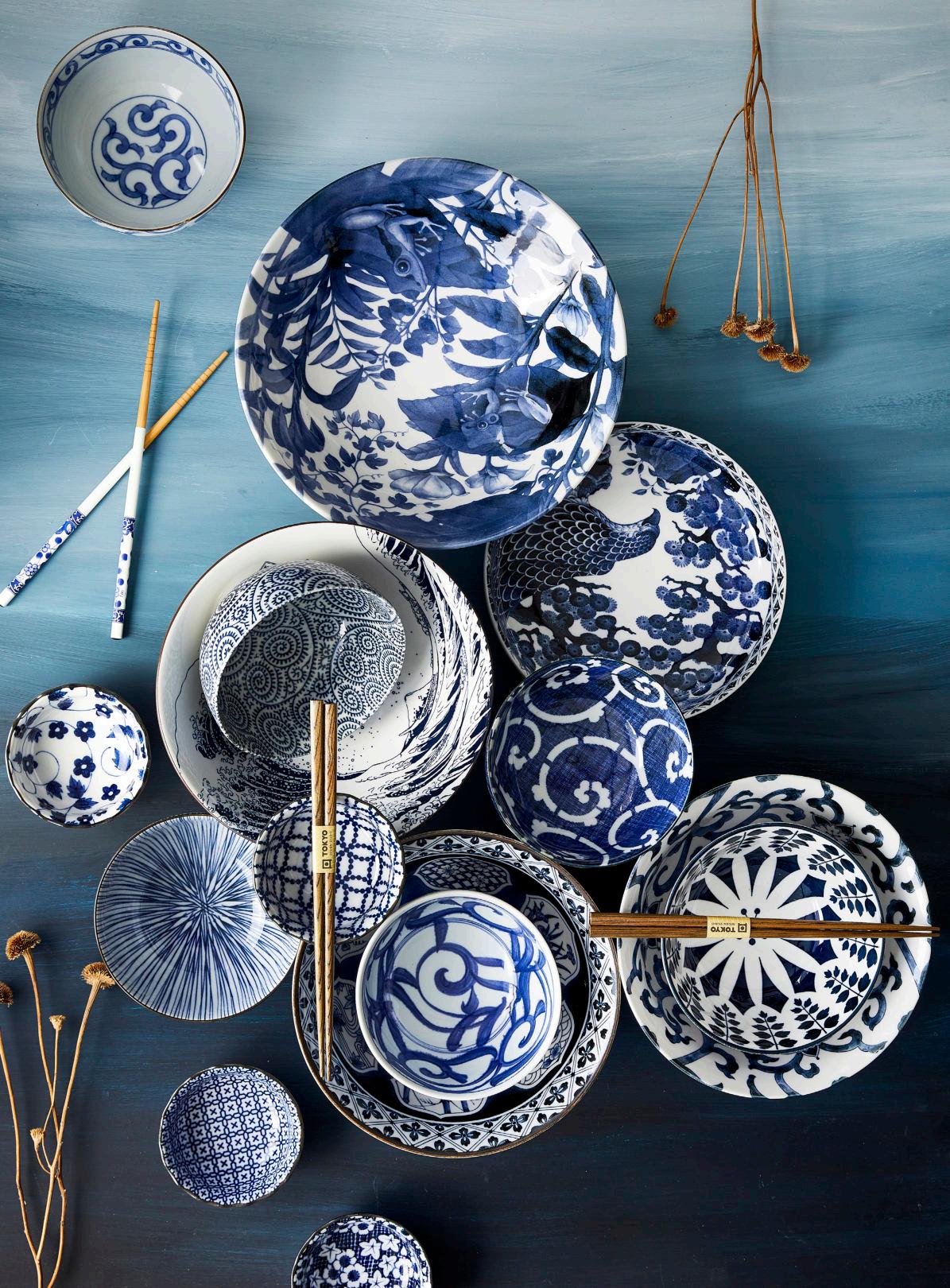 This succesful collection is created using a technique called "sometsuke." This technique involves painting cobalt blue pigment onto the white porcelain surface before glazing and firing it. The products often feature intricate floral motifs, such as cherry blossoms, peonies or chrysanthemums, The combination of blue and white is highly prized in Japanese culture and is often associated with elegance, simplicity, and a sense of tranquility.