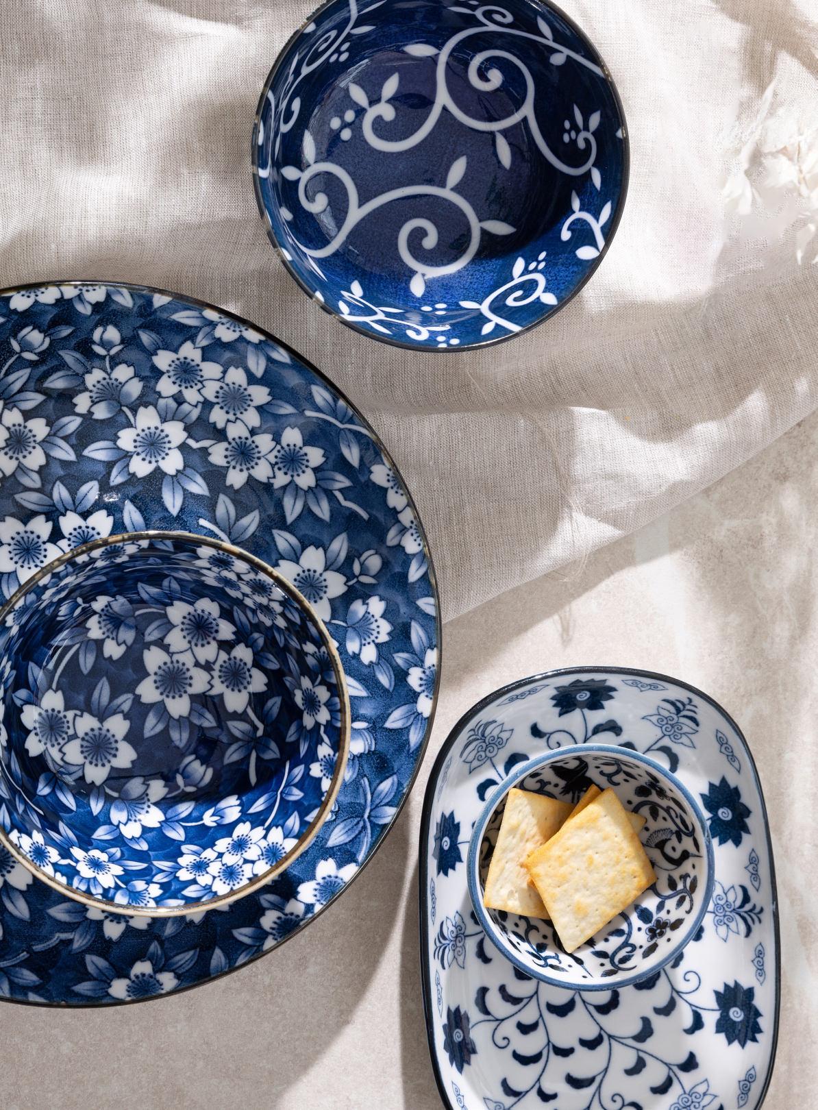 Hana Blue in Japanese tableware holds deep symbolic meaning, representing the connection between nature, beauty, and the fleeting moments of life. The word hana, meaning flower, is central to this concept, as floral designs are used to reflect the changing seasons. Each bloom carries its own story, symbolizing the passage of time and the beauty found in every moment; cherry blossoms capture the essence of spring's renewal, while chrysanthemums reminds us of the transition into autumn. This thoughtful integration of nature's cycles creates tableware that not only serves its practical purpose but also connects to the rhythm of life and the seasons.