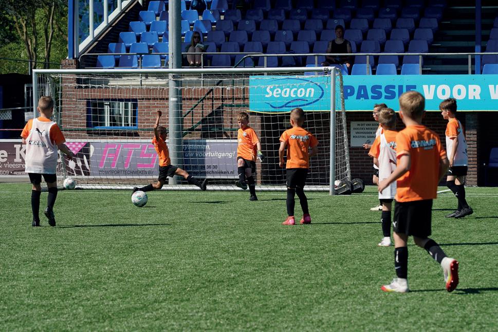 Volgend seizoen stappen de jongens over naar het grote-mensen-voetbal: een heel veld! Dat is even andere koek. Om ze alvast een beetje te laten wennen, planden we doordeweekse oefenwed-