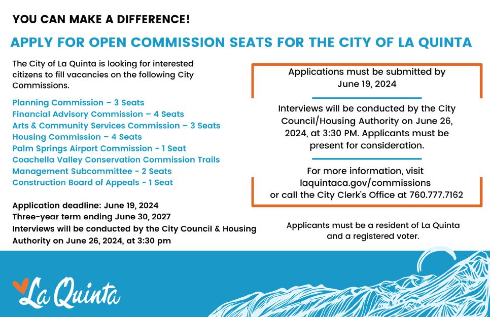 This is an opportunity for anyone who wants to be part of La Quinta’s decisionmaking process and help map the City’s future on the Arts & Community Services, Financial Advisory and Planning commissions, to name a few. Applications are being accepted for the following: