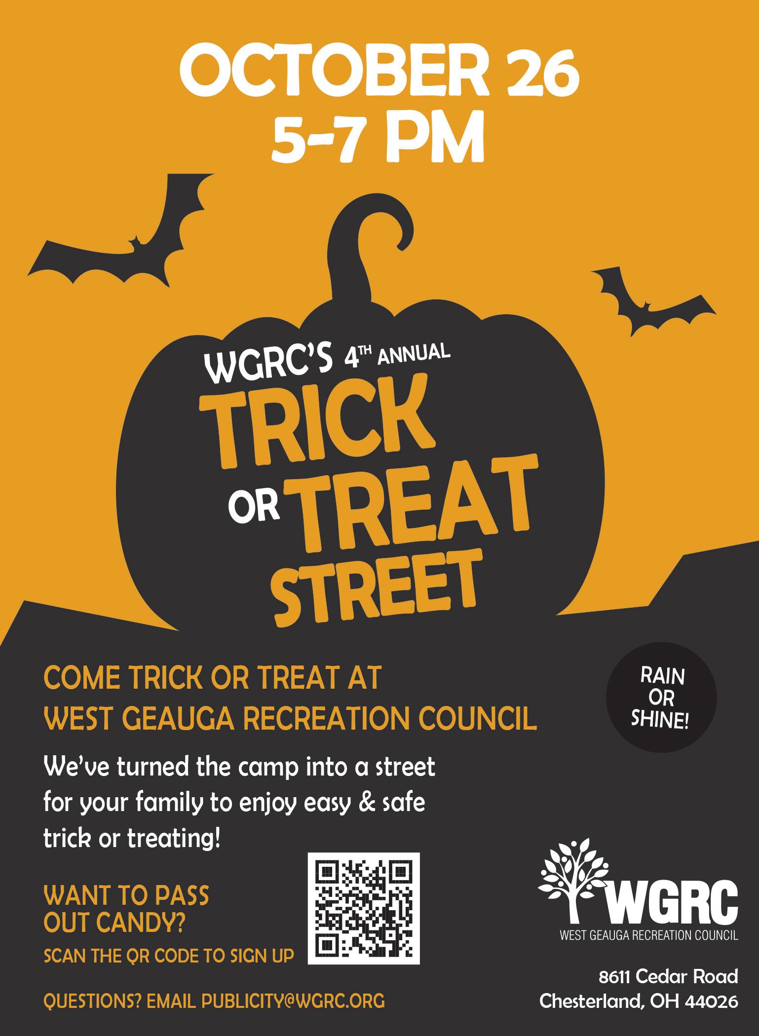 West Geauga Recreation Council (WGRC) is hosting its fourth annual Trick or Treat Street at the WGRC campgrounds, 8611 Cedar Road, Chester Township. The free event is open to the public. For information, visit wgrc.org.