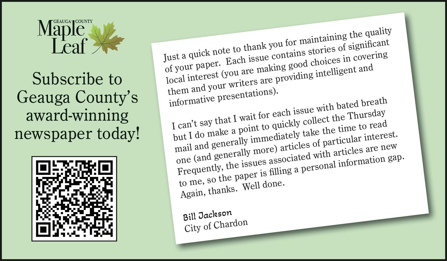 1. FREE one-year online-only subscription to the Geauga County Maple Leaf, a six-time winner of Ohio Newspaper of theYear, OR