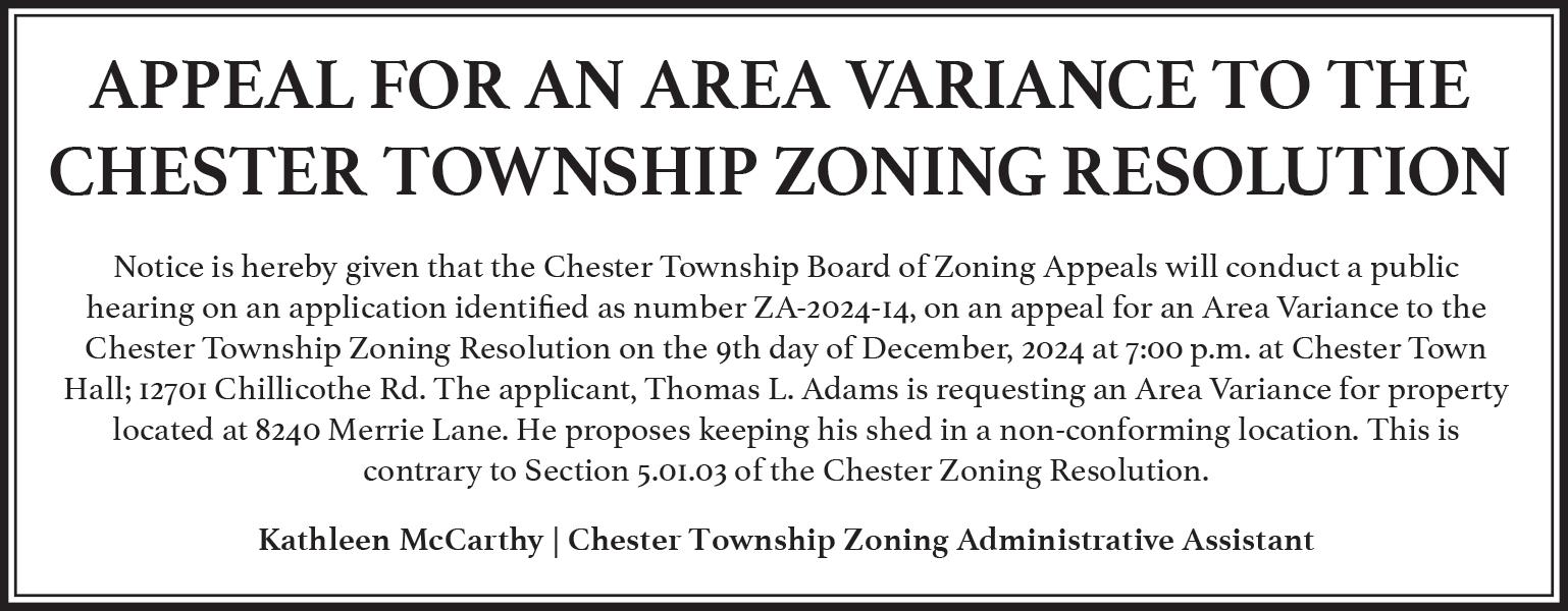 Chester Township: Nov. 25, 7 p.m., Zoning Commission; Nov. 27, 8 a.m., Board of Trustees; Dec. 4, 7 p.m., Zoning Commission; Dec. 9, 7 p.m., Board of Zoning Appeals; Dec. 12, 6:30 p.m., Board of Trustees; Dec. 18, 7 p.m., Zoning Commission; Dec. 26, 6:30 p.m., Board of Trustees. All meetings are held at the Township Hall, 12701 Chillicothe Road, unless otherwise noted.