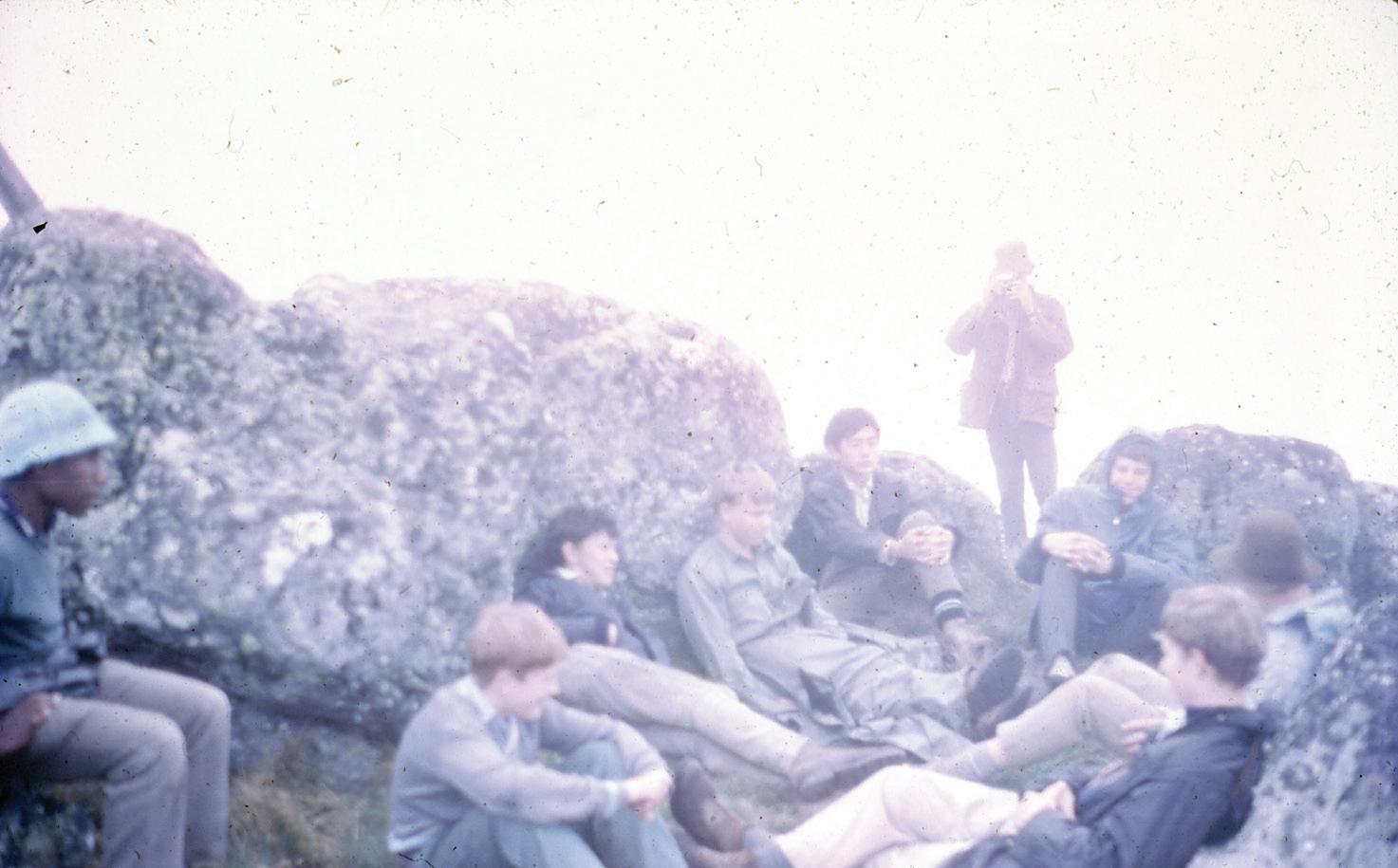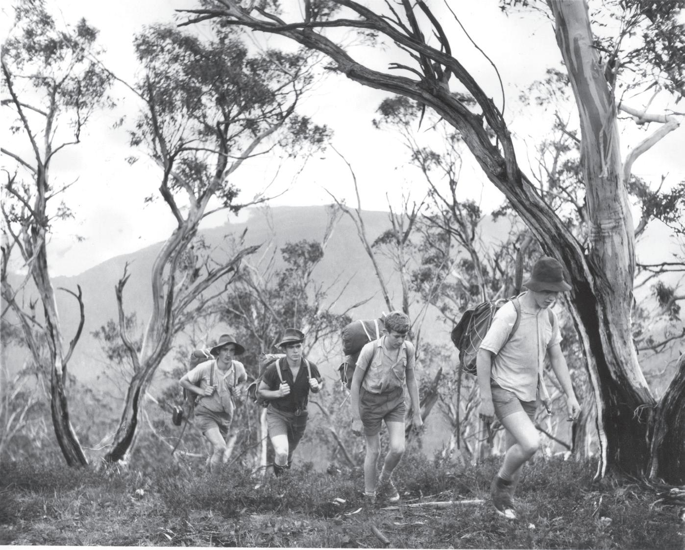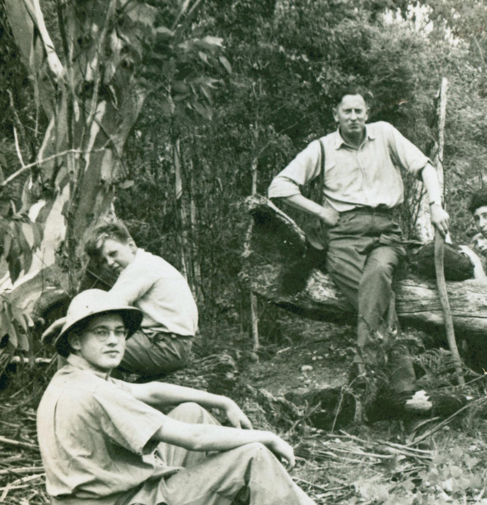 Main Photo: Sir James Darling (Headmaster 1930-61) and a small group climbed Mt Timbertop on Good Friday, 1952, including David Griffith (FB’52) in pith helmet (far left).