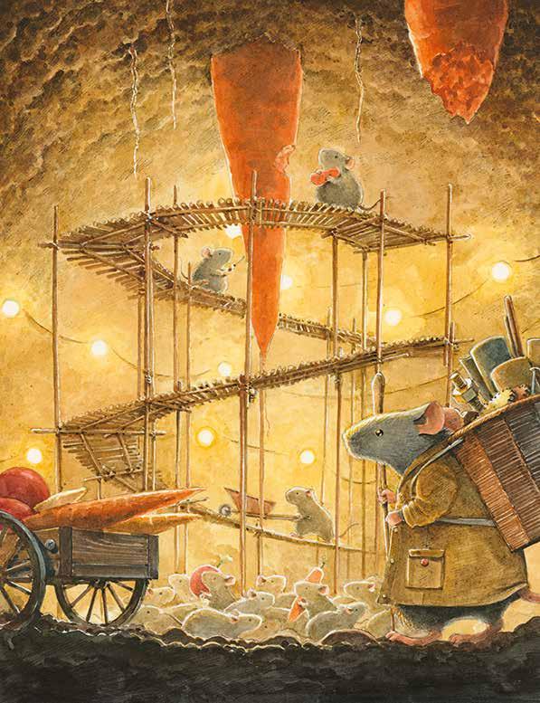 Le arvicole vivevano nei cunicoli sotto un orto. Un topo, che non era però un’arvicola, scese in profondità per una rampa tortuosa dai gradini di legno. Si reggeva su un bastone e portava una cesta sulle spalle. Era tutto chino sotto il peso e nell’oscurità faceva piccoli passi cauti. Dopo poco, raggiunse una galleria orizzontale. Un paio di metri più in là, il topo si ritrovò in una caverna illuminata. Ovunque brulicavano dei batuffoli di pelo grigiobruno. Dal soffitto pendevano tuberi e radici e contro le pareti erano appoggiati pale e picconi. Il topo osservò quel viavai sotterraneo, prese un attimo fiato e poi entrò in una galleria laterale un po’ nascosta.