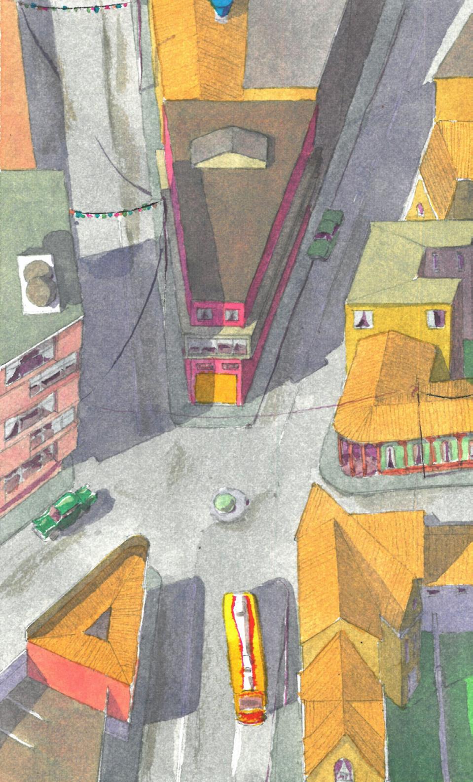 Portada: Vista central de la ciudad de Bogotá. Es una acuarela sobre papel. La composición muestra una calle inspirada en la arquitectura tradicional del barrio La Calendaría. Resalta la intersección de las cuatro calles, en las que se puede ver distintos medios de transporte siendo utilizados. La vista es desde arriba.