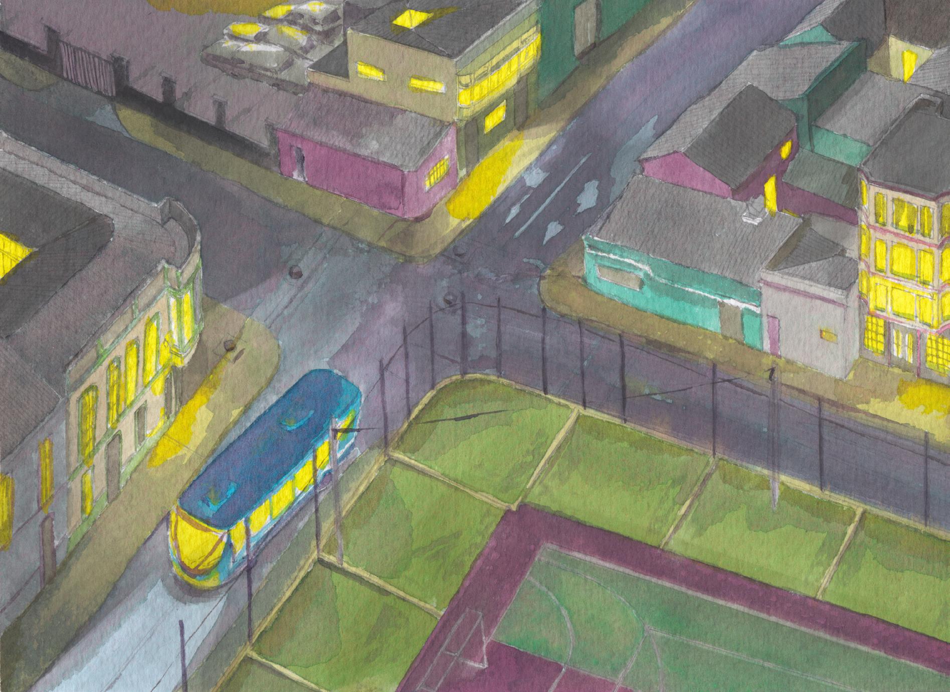 Vista central #3. Manuel Arteaga / Descripción: Se trata de una vista central de la ciudad de Bogotá. Es una composición de acuarela sobre papel. La composición muestra el cruce de cuatro direcciones en el barrio Las Nieves. Es un paisaje nocturno.