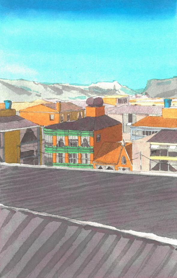 Contraportada: Se trata de una vista central de la ciudad de Bogotá. Es una acuarela sobre papel, cuya composición muestra el tipo de arquitectura que hay en el sector de Santa Fe. Al fondo están los cerros orientales. Resalta el color gris de los techos de los distintos edificios. El gris hace contraste con las paredes naranjas de estas construcciones.