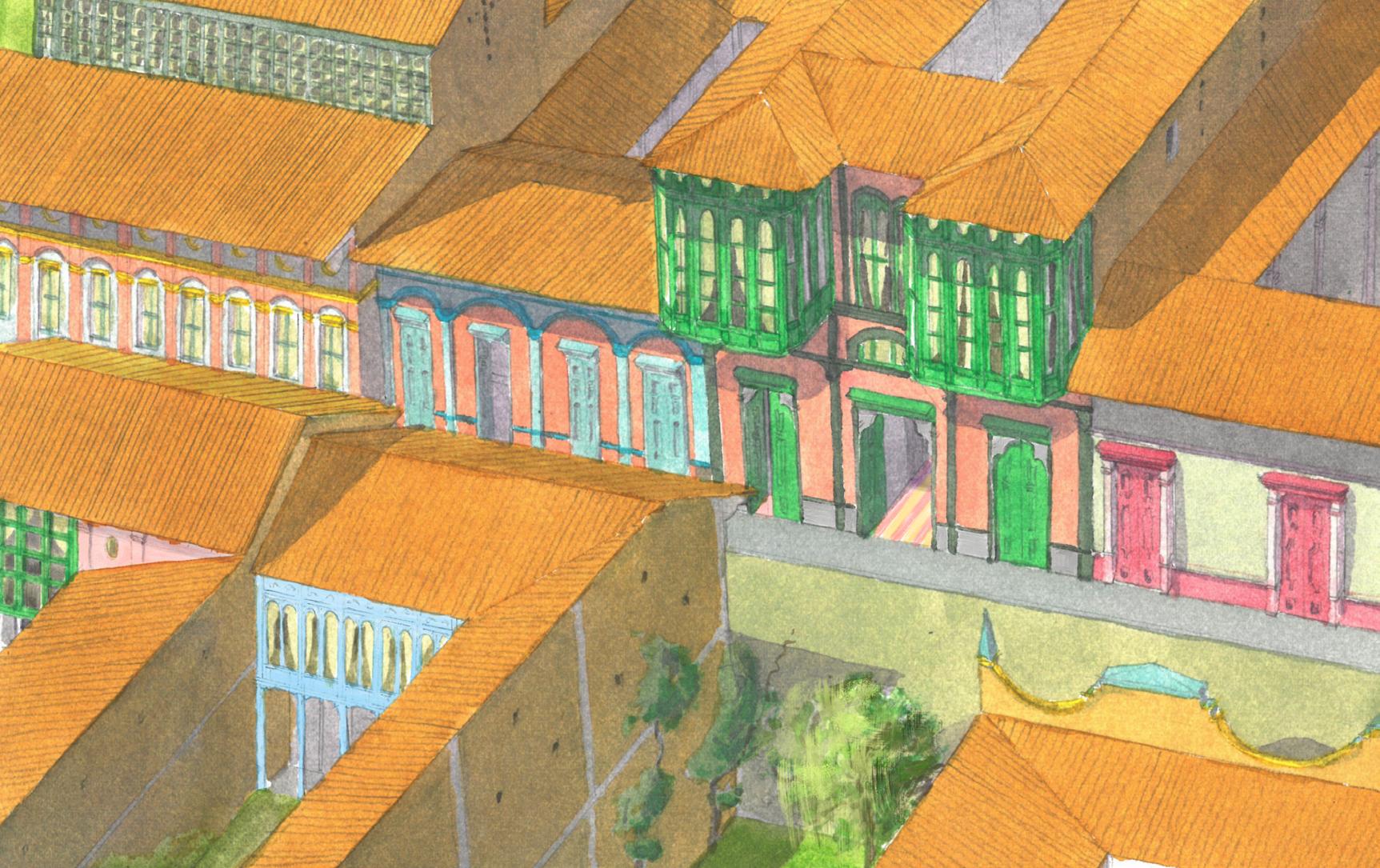 Vista central #1. Manuel Arteaga / Descripción: Vista central de paisaje inspirado en Bogotá. Acuarela sobre papel. Es una composición que muestra la arquitectura típica del centro de la ciudad de Bogotá.