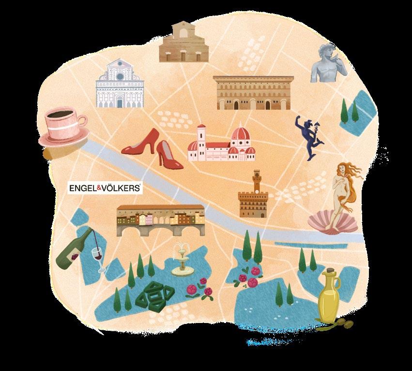 albergando muchas empresas familiares que desde hace generaciones transmiten su arte. Algunos de los nombres más influyentes de la moda también tienen sus raíces en Florencia: en 1921, Guccio Gucci abrió aquí su taller de marroquinería, seguido en 1927 por el taller de calzado de Salvatore Ferragamo (ver artículo de portada). A pesar de su relevancia internacional, ambas firmas mantienen un profundo vínculo con su ciudad natal, a través de museos, tiendas insignia y un estilo inconfundible. Por mucha historia que acumule, Florencia no se rinde al temor reverencial, sino que brilla y late con vida. Aquí, el día comienza con un café, tomado de pie en la barra del bar, y continúa más tarde con una copa de Chianti de las cercanas colinas o con un helado. Para contemplar la ciudad desde lo alto, hay que subir a la plaza de Michelangelo. Al saborear un Negroni agridulce y rojo como el atardecer, se percibe la atmósfera singular de Florencia: la cercanía entre pasado y presente, el orgullo artesanal y la visión empresarial de futuro. Florencia es sinónimo de grandes familias, arte y la armoniosa fusión entre tradición y cambio.