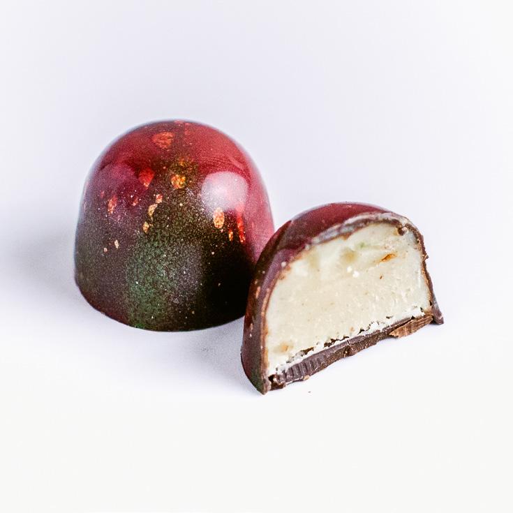 Hand-painted dark chocolate shell filled with white chocolate ganache infused with whiskey, nutmeg and Marsala. 01 96-COUNT CASE • WHOLESALE 1.04 • RETAIL 2.00