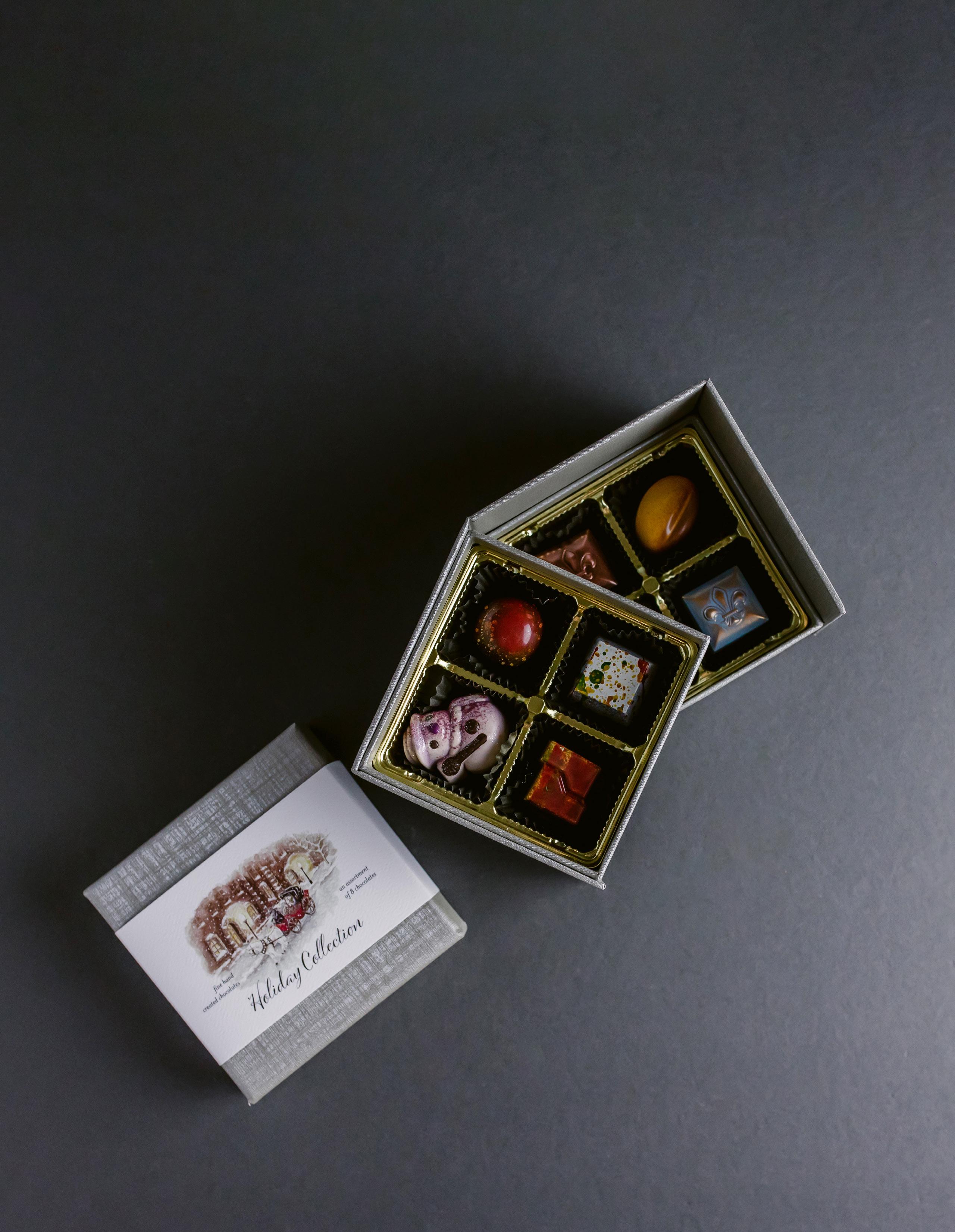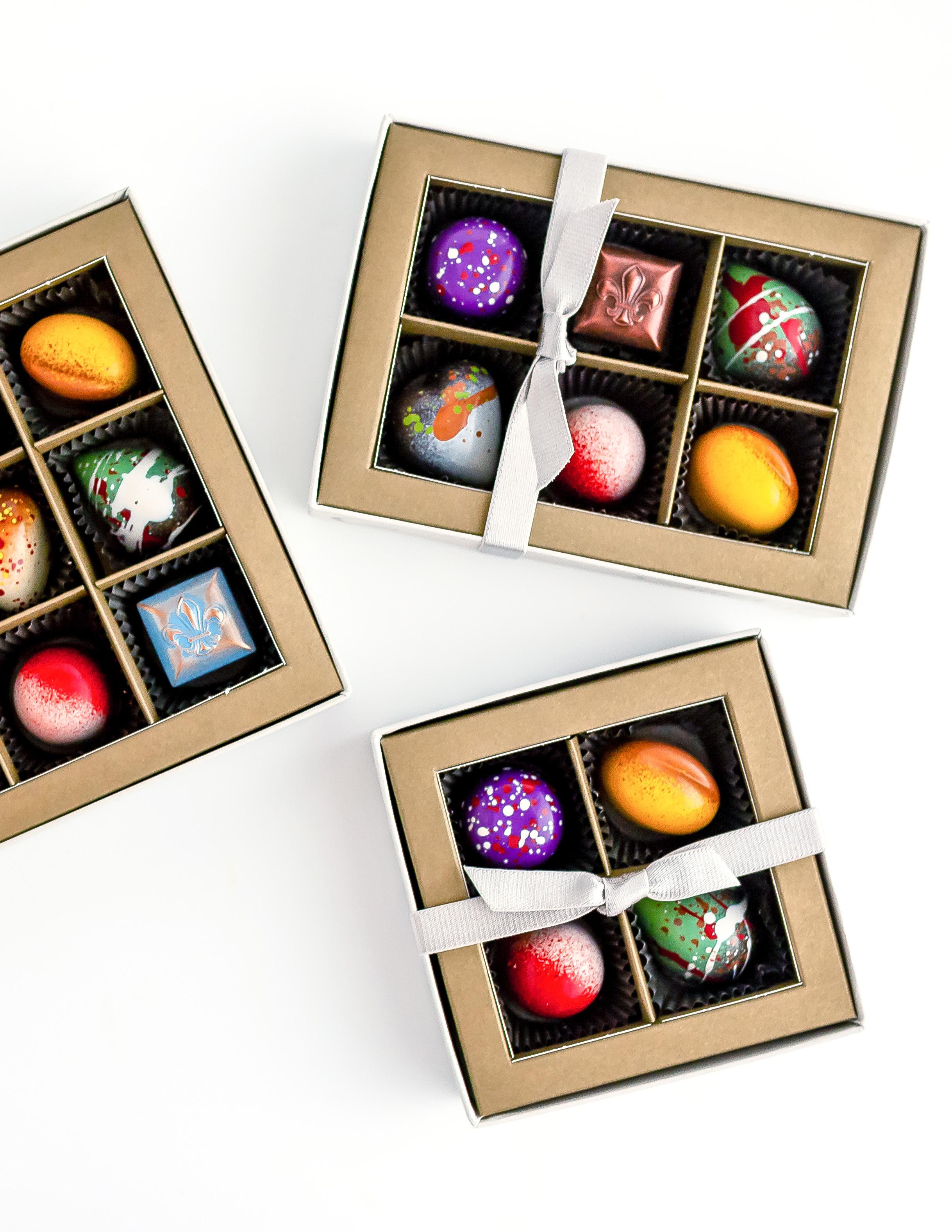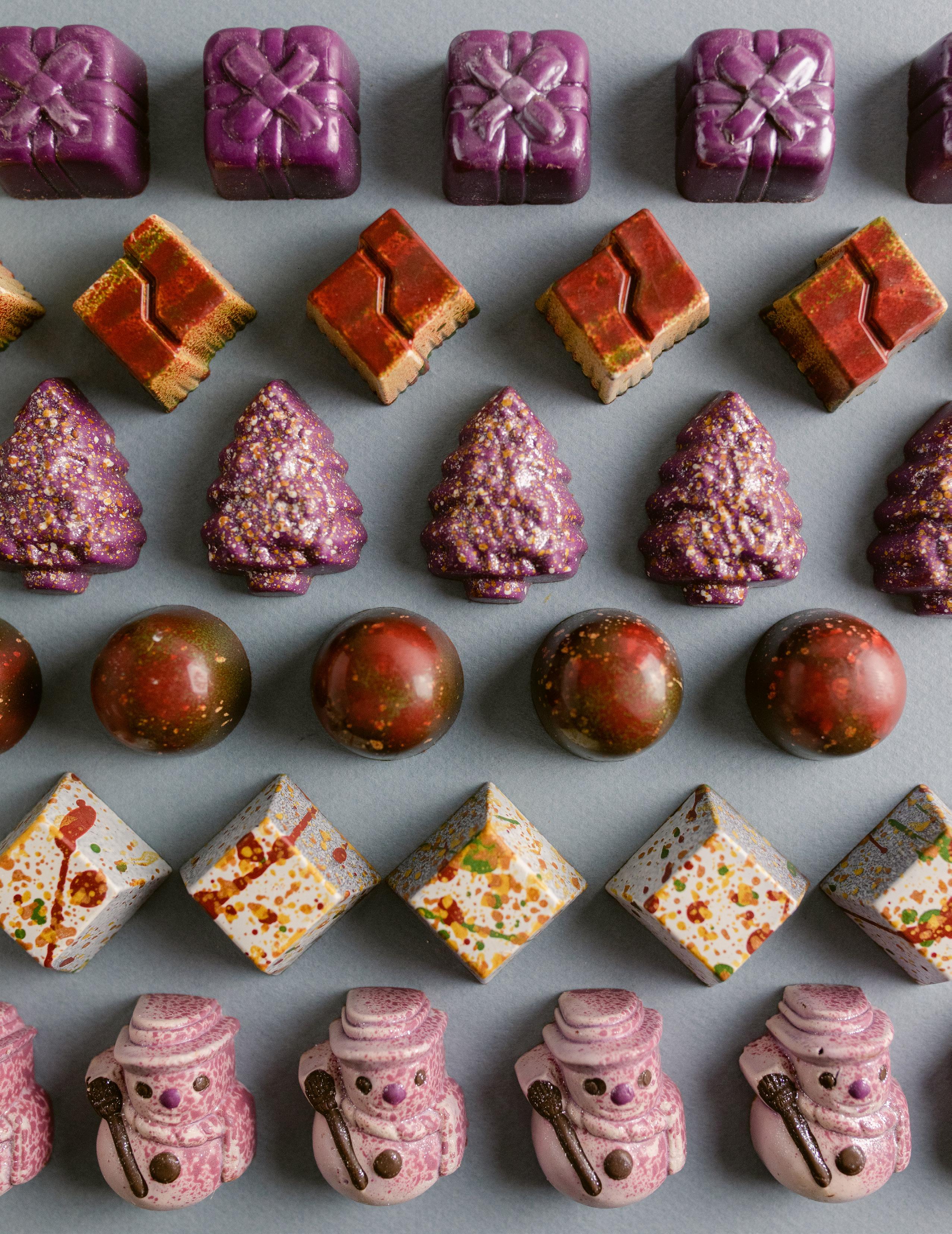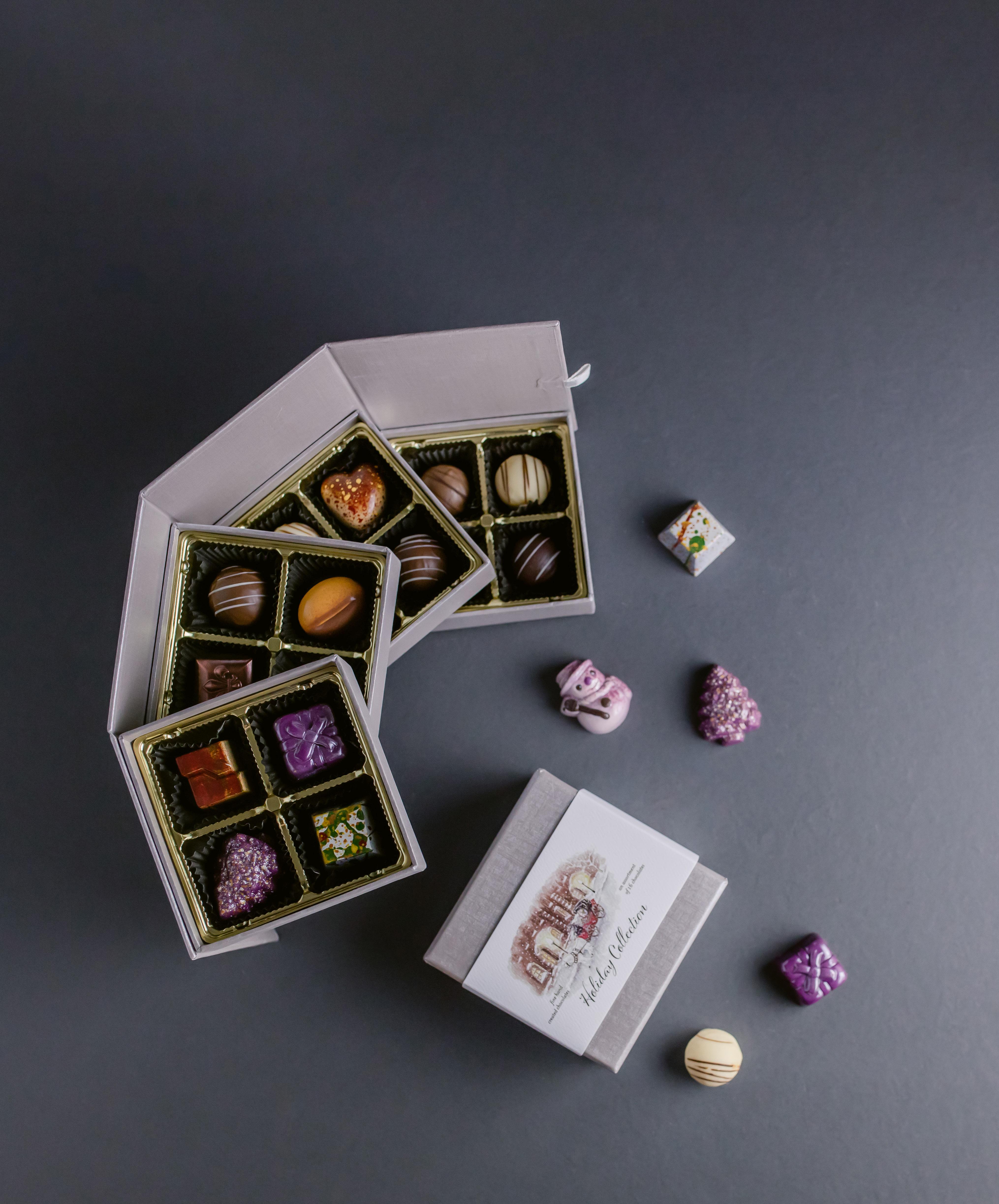 Hand-painted gourmet chocolates filled with flavors that are evocative of the sweet nostalgia of the holiday season.