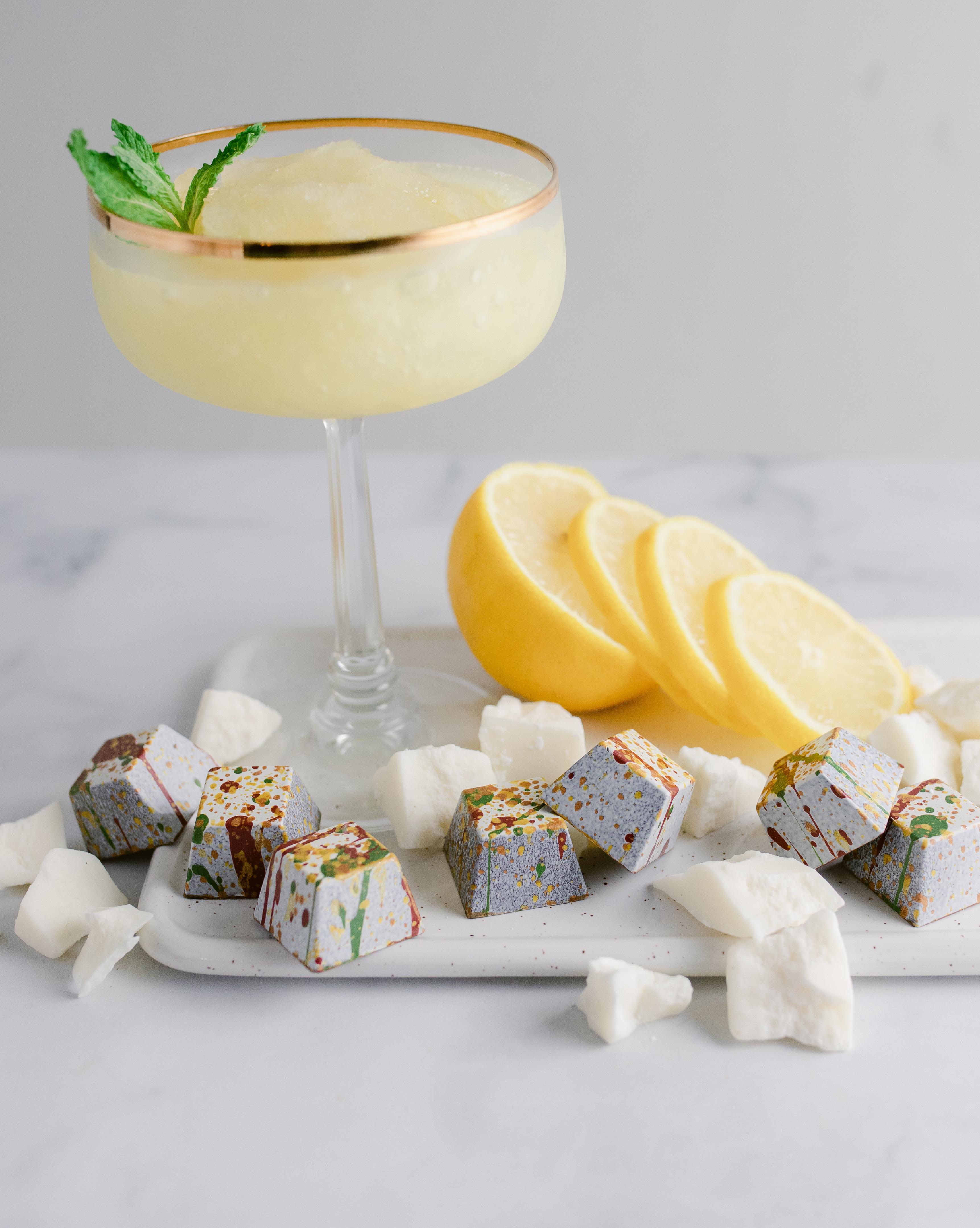 Hand-painted dark chocolate shell filled with dark chocolate ganache infused with Meyer lemon and rum.