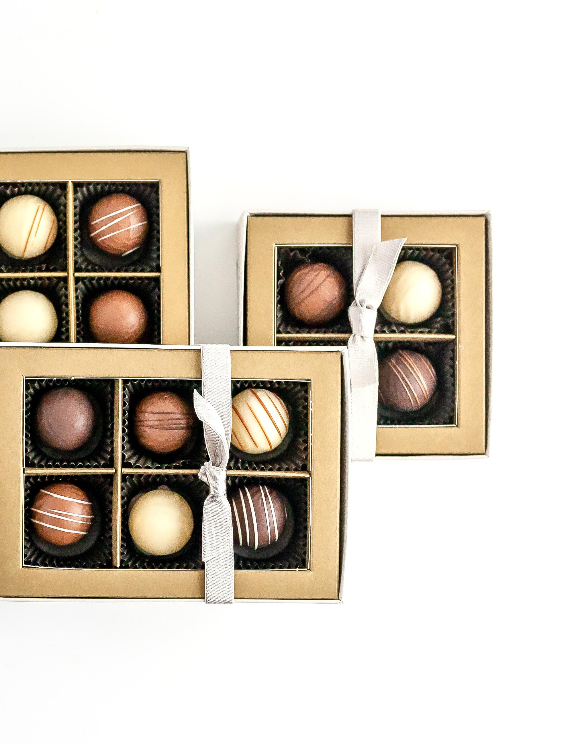 Hand-poured, ornately decorated truffles blended with infused fresh cream and the essence of exotic extracts. Each truffle is delicately dipped into one of the three chocolate couvertures.