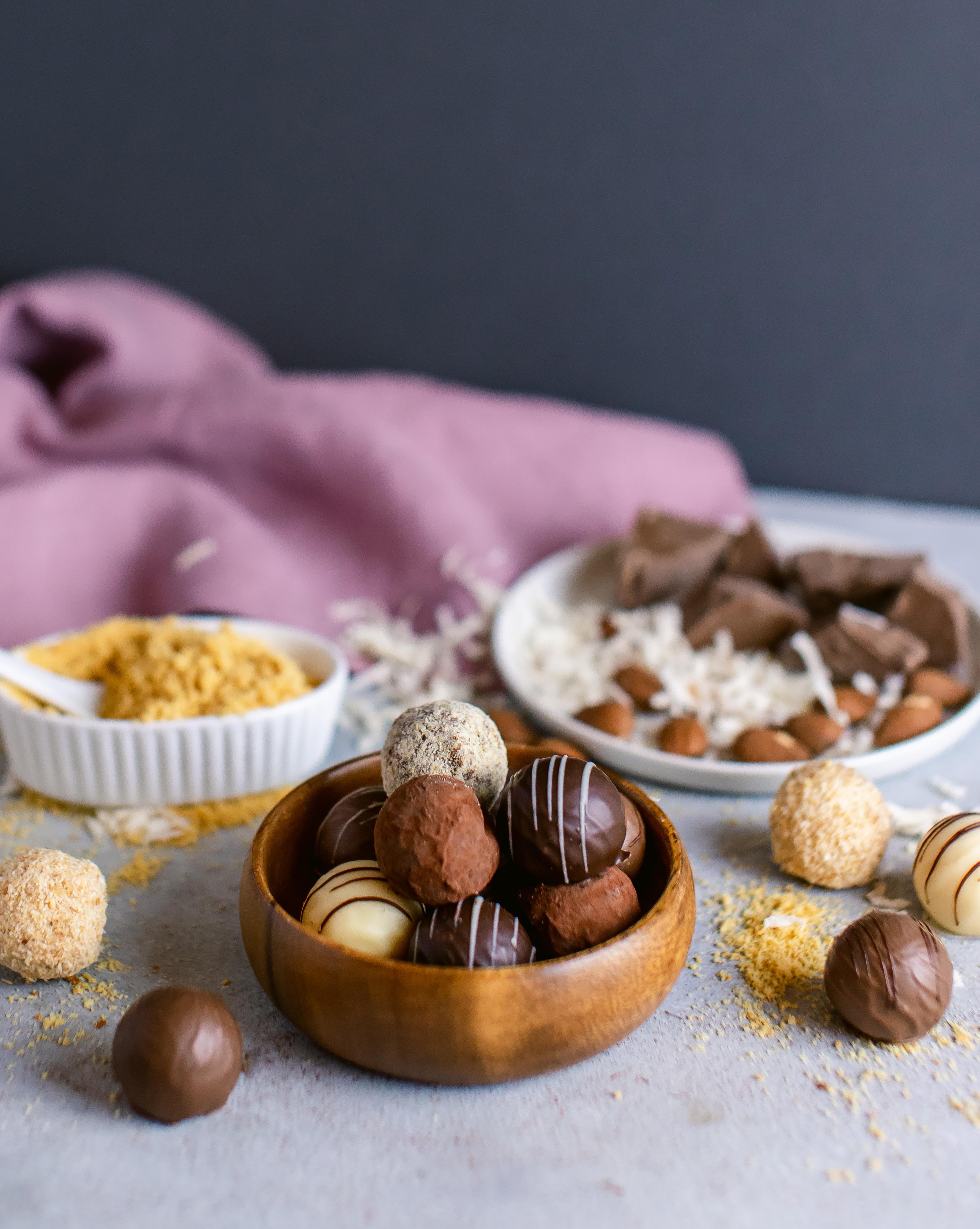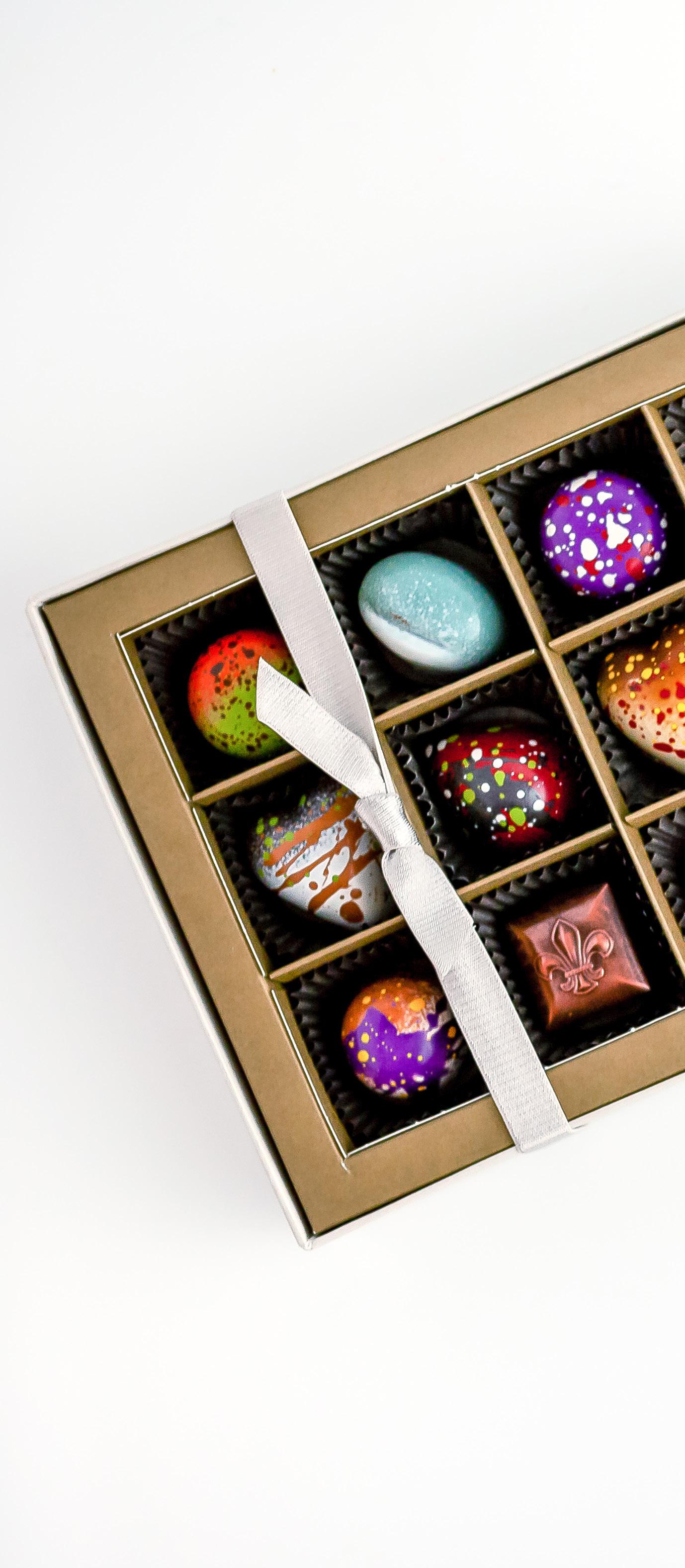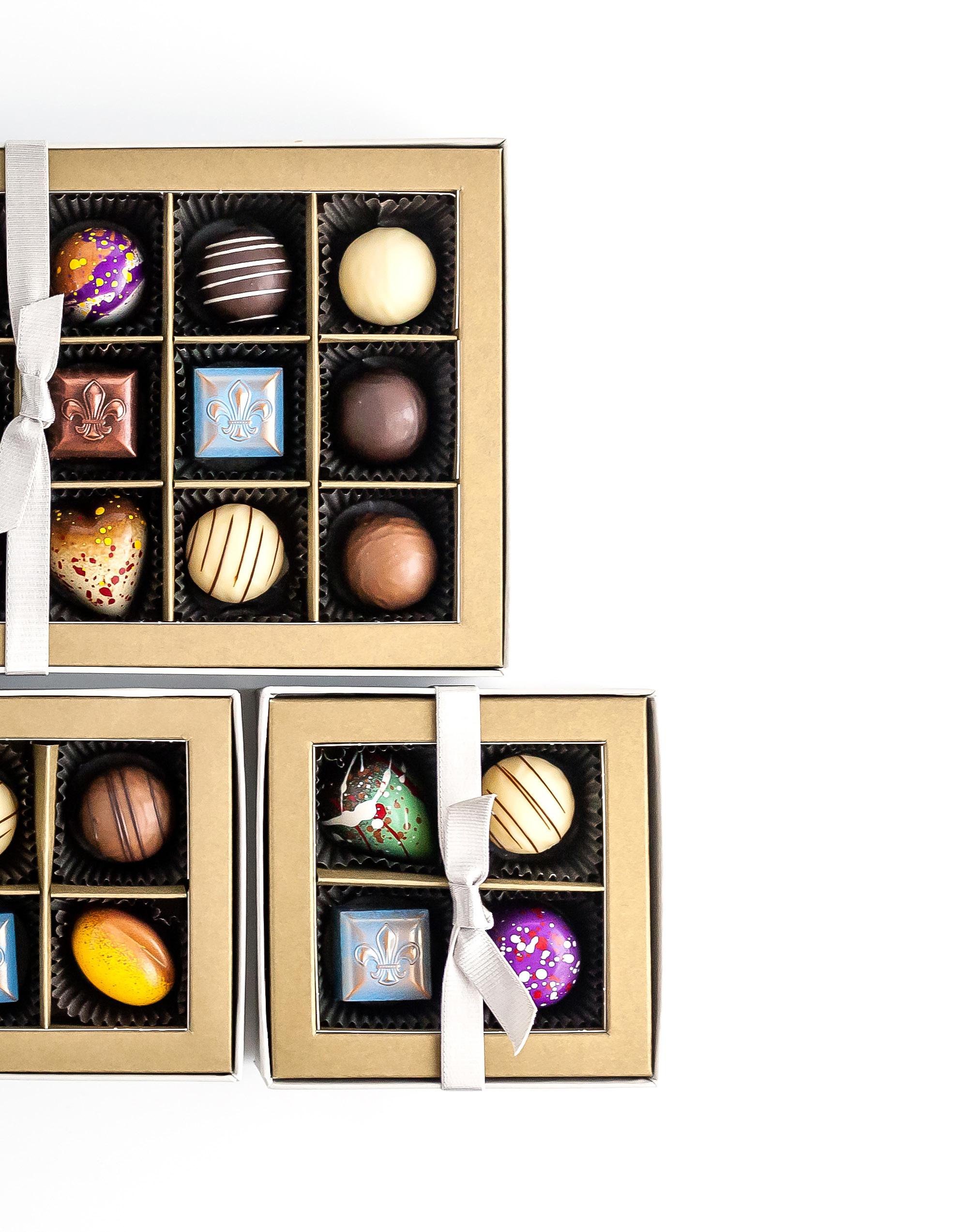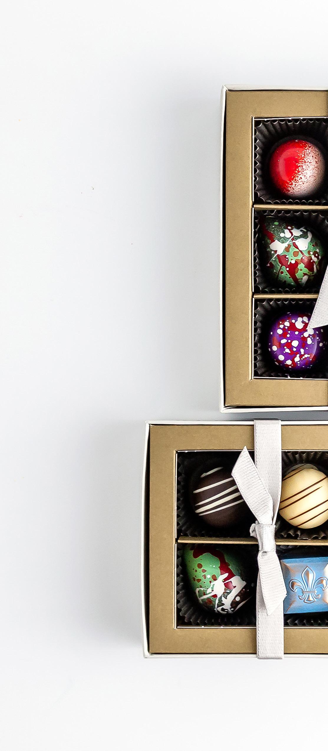 Hand-poured, ornately decorated truffles blended with infused fresh cream and the essence of exotic extracts. Each truffle is delicately dipped into one of the three chocolate couvertures.