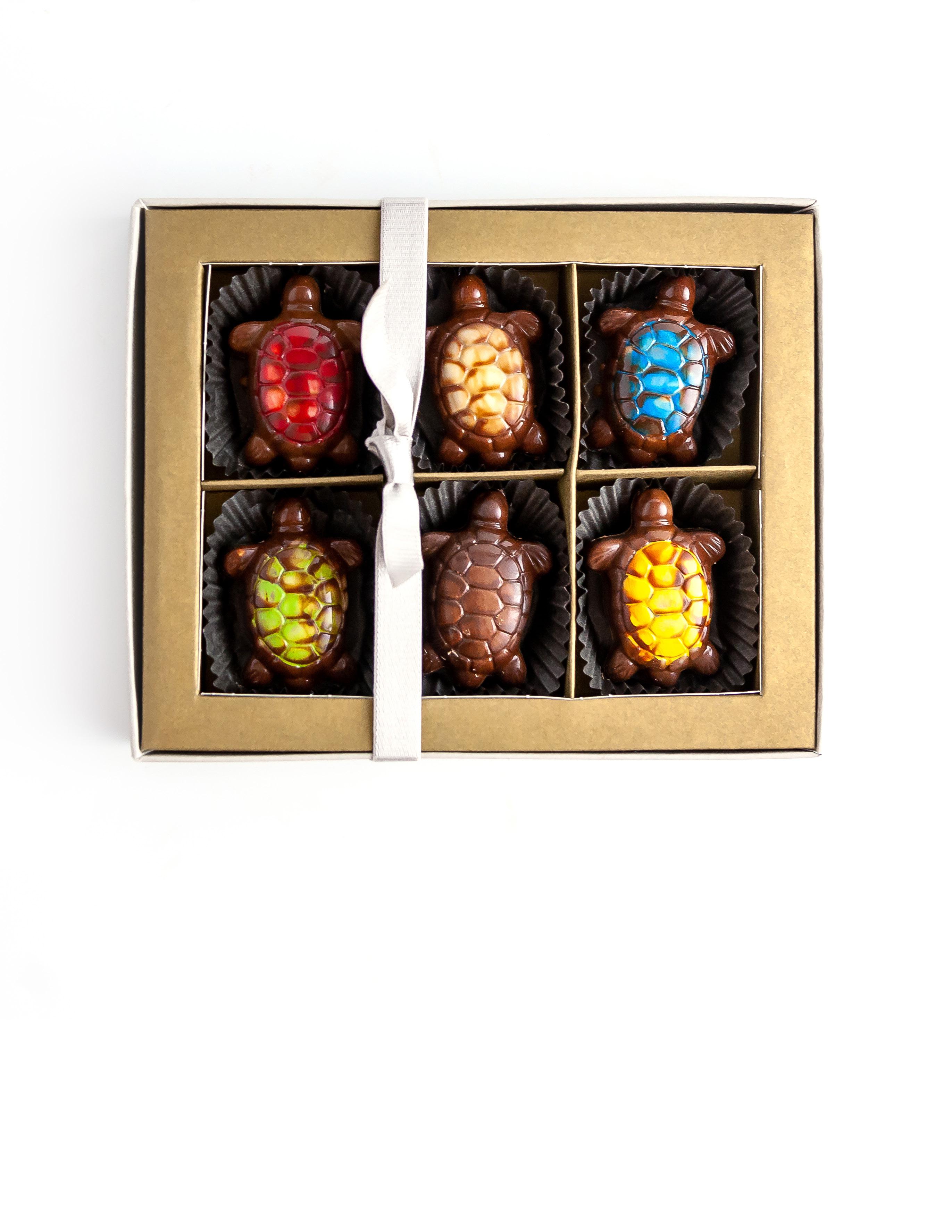 Ghyslain’s Turtle Mosaique Collection features our hand-painted milk chocolate turtles. Each color represents a different toasted gourmet nut delicately tucked into a shell filled with butter caramel.