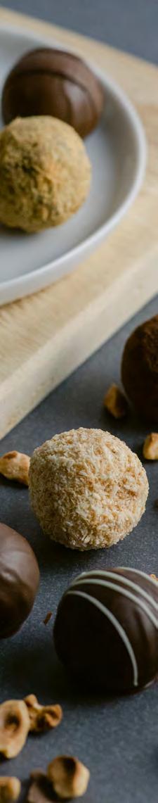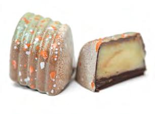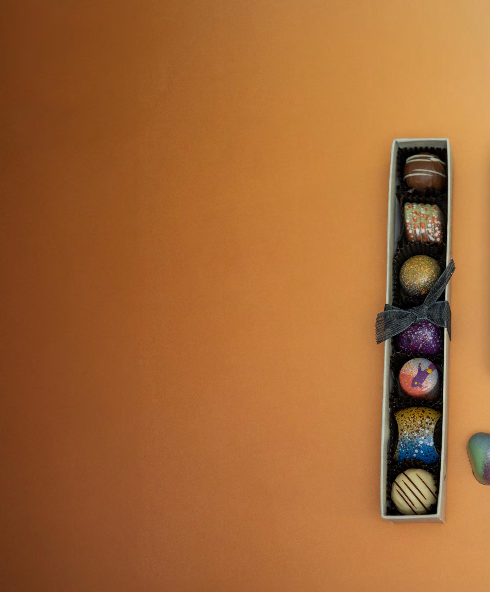 Hand-poured, ornately decorated truffles blended with infused fresh cream and the essence of exotic extracts. Each truffle is delicately dipped into one of the three chocolate couvertures.