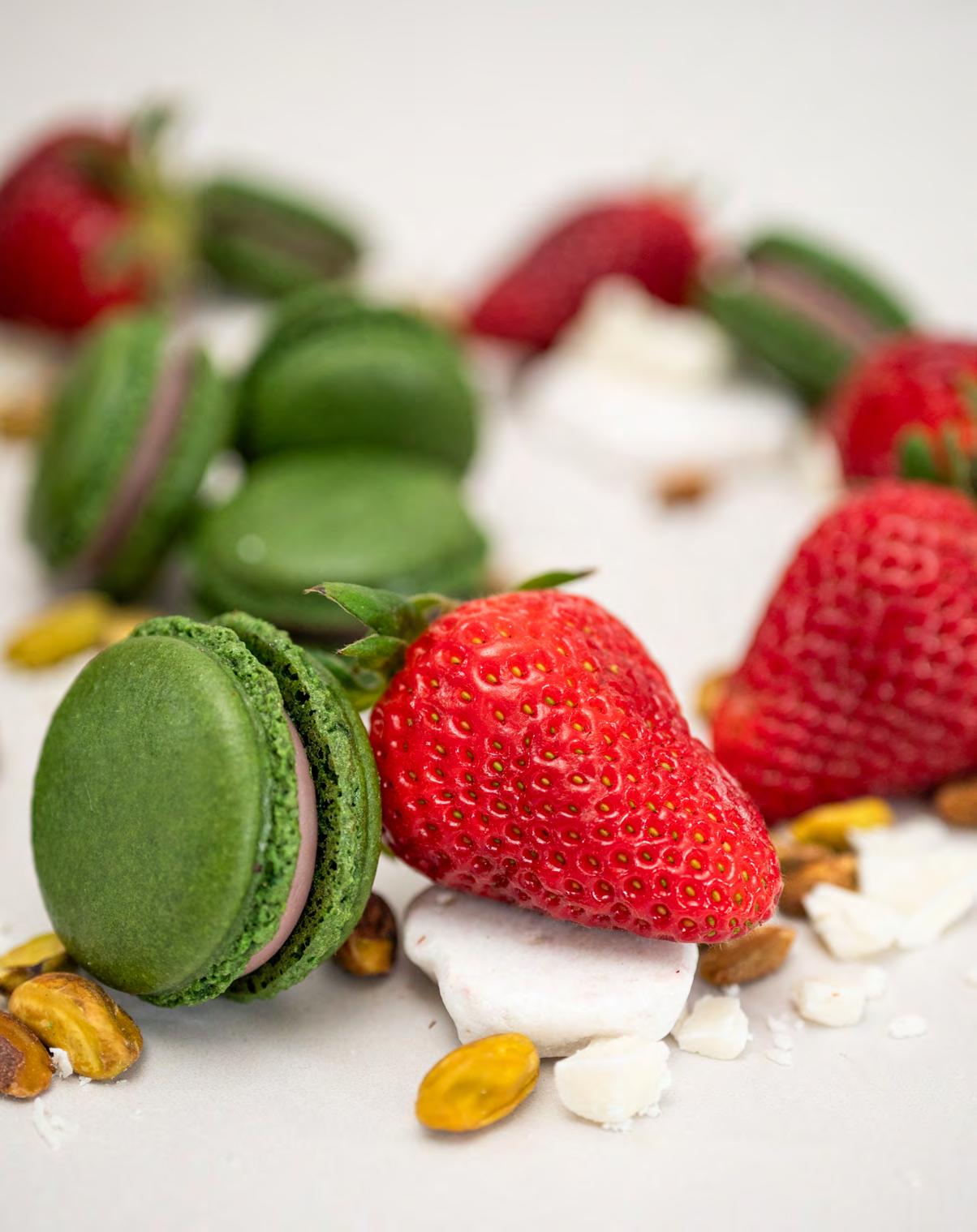 Pistachio Macaron with white chocolate strawberry ganache.