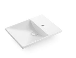La plasticidad de la porcelana se contrapone a la rigurosidad geométrica del rectángulo para dar vida y dinamismo a estos lavabos.
